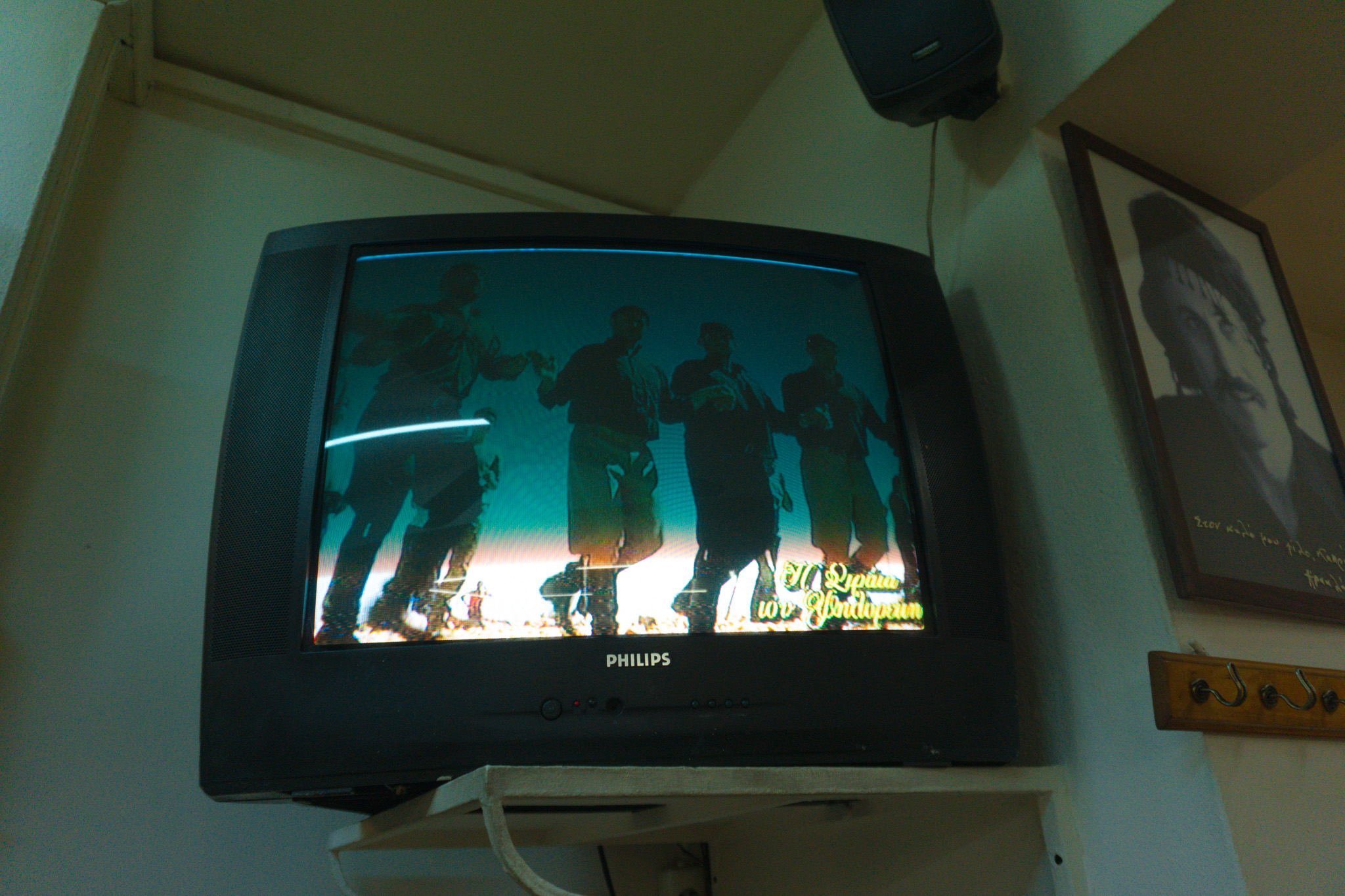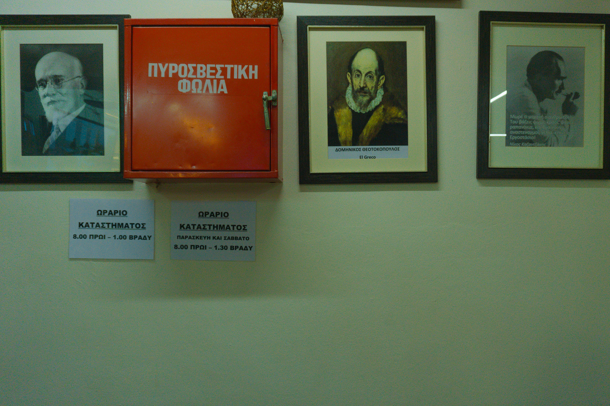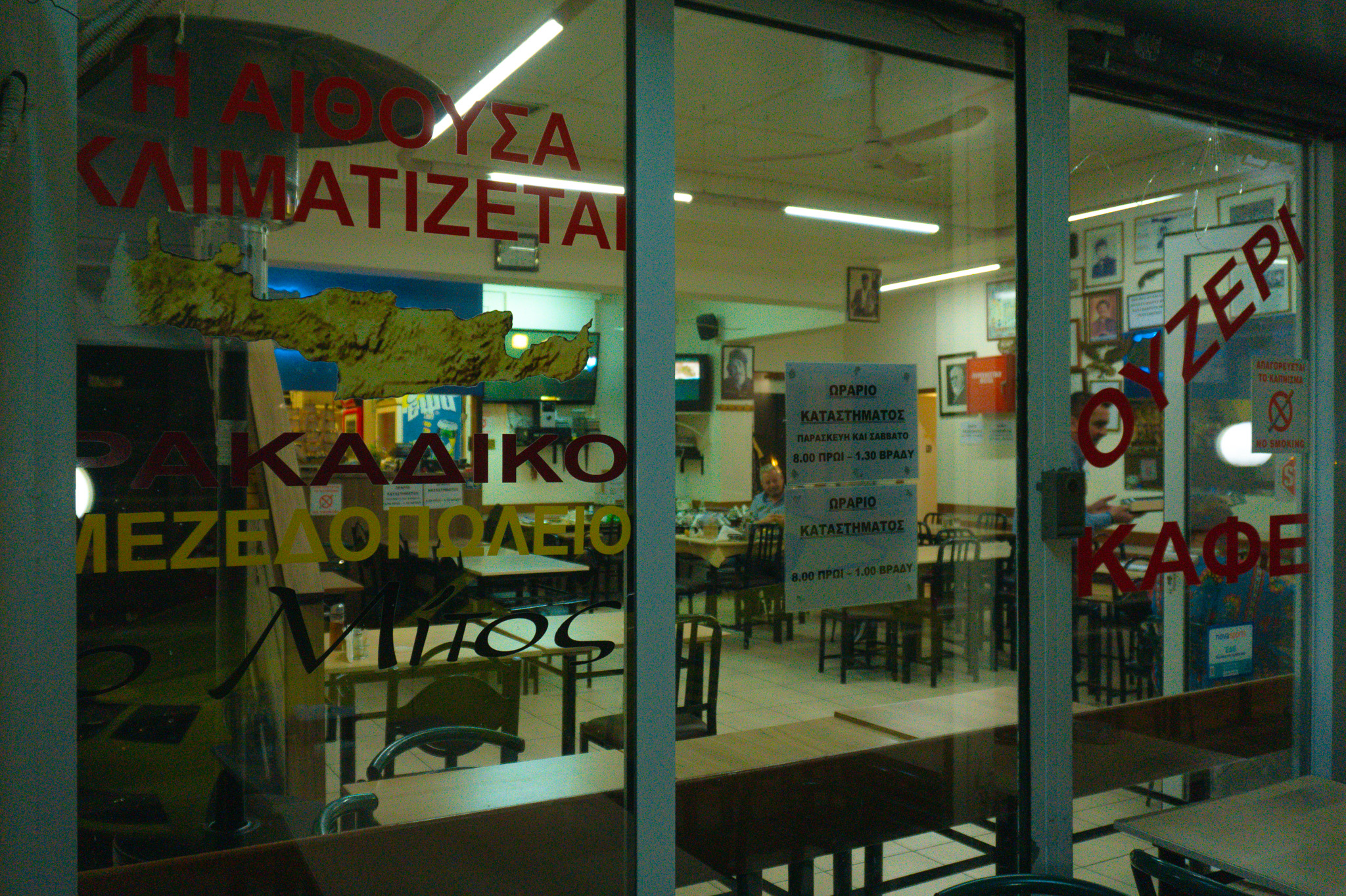 Η διακόσμηση δεν σε αφήνει λεπτό να ξεχάσεις την Κρήτη. Δύο τηλεοράσεις δίπλα – δίπλα, η μία να παίζει αγώνες, ταινίες και σήριαλ και στην άλλη να χορεύουν κρητικούς χορούς. Στους τοίχους Βενιζέλος, Ελ Γκρέκο, Ξυλούρης και Καζαντζάκης. Συχνά πυκνά μάλιστα έρχονται και τα όργανα και τότε η βραδιά διαστέλλεται, κλείνουν το καφενείο ξημερώματα.