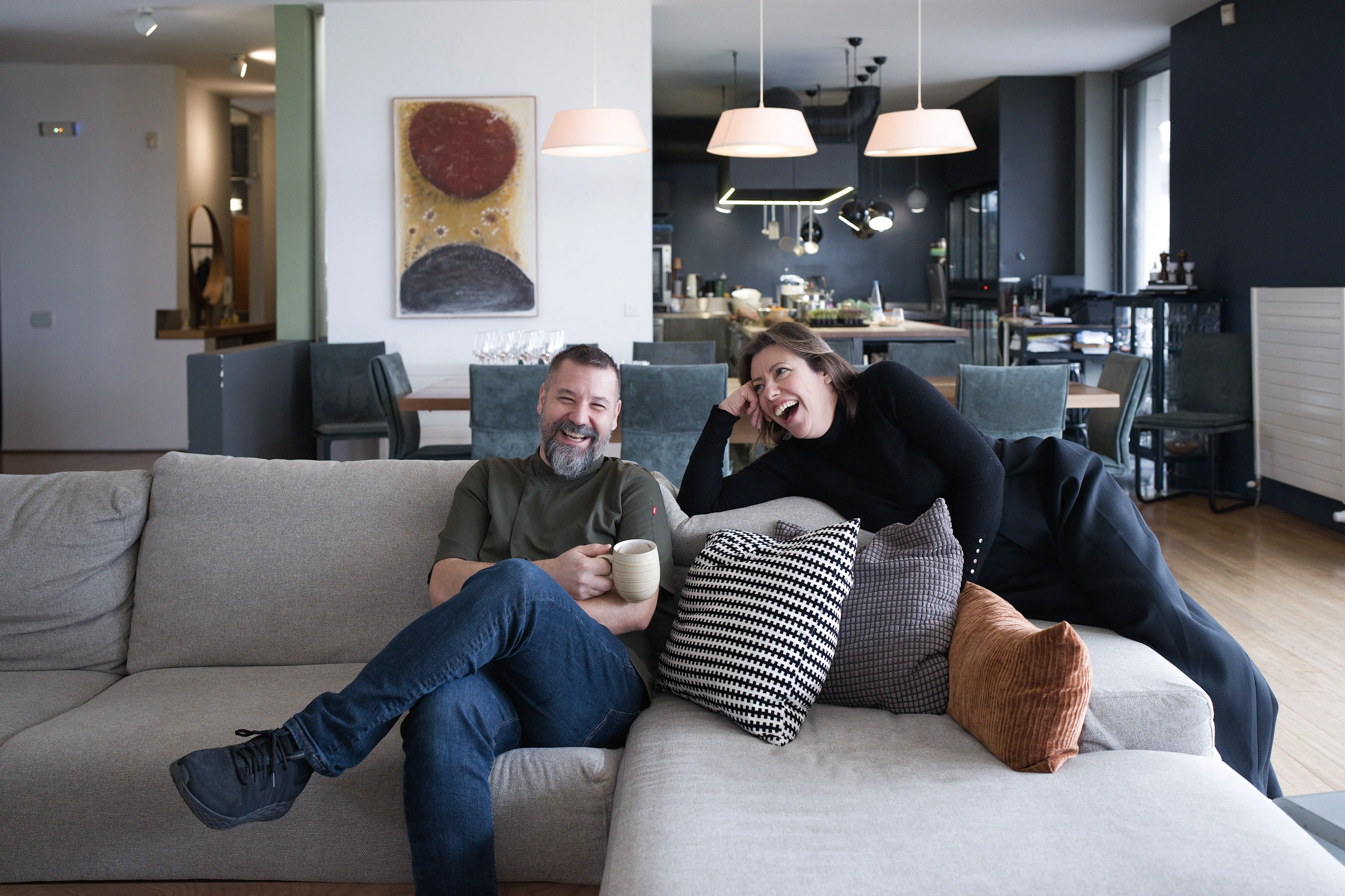 Θέλαμε να βρούμε ένα λοφτ, έναν βιομηχανικό χώρο να χωριστεί, να γίνει το σπίτι μας και να γίνει και ένας χώρος κουζίνας. Βρήκαμε κάποιους χώρους, δεν μπορούσαμε να βγάλουμε άδεια και αναζητήσαμε μια μονοκατοικία. Είδαμε 40 ακίνητα, το τελευταίο ήταν αυτό. Αποφασίσαμε ότι αυτό θα είναι το σπίτι μας και θα ετοιμάζουμε το μενού μαζί με τον κόσμο. Ανάλογα με τις ανάγκες θα διαλέγουμε κρασιά. Θα γίνονται όλα για την συγκεκριμένη παρέα.