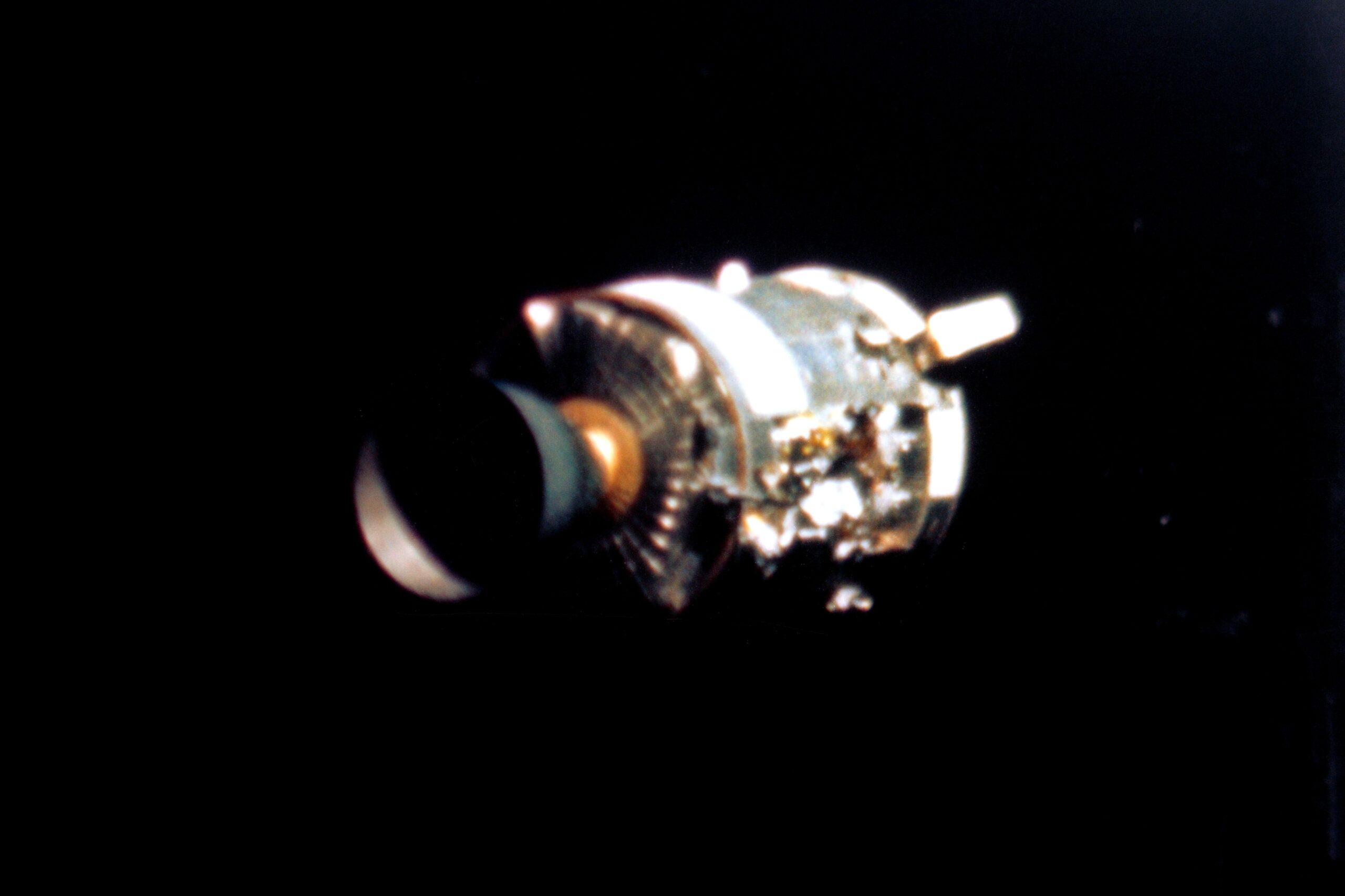 Ενημέρωσαν το Χιούστον ότι έλειπε ένα ολόκληρο πάνελ από το εξωτερικό του θαλάμου, οι κυψέλες καυσίμου είχαν μετακινηθεί παίρνοντας κλίση, η κεραία υψηλής απολαβής είχε καταστραφεί τελείως και σημαντική ποσόστητα από συντρίμια υπήρχαν παντού. Το μόνο που απέμενε, ήταν να αποσυνδεθεί η σεληνάκατος από τον θάλαμο διακυβέρνησης, λίγο πριν την επανείσοδο στην ατμόσφαιρα. Η κατασκευάστρια εταιρεία της σεληνακάτου, Grumman, υπολόγισε ακριβώς την πίεση του αέρα που θα έπρεπε να χρησιμοποιηθεί, ώστε να διαχωρίσει τα δυο μέρη. Η αποσύνδεση πραγματοποιήθηκε με επιτυχία, η σεληνάκατος καταστράφηκε μόλις μπήκε στην ατμόσφαιρα και τα συντρίμμια της κατέληξαν στην Τάφρο Τόνγκα, στον Ειρηνικό Ωκεανό.