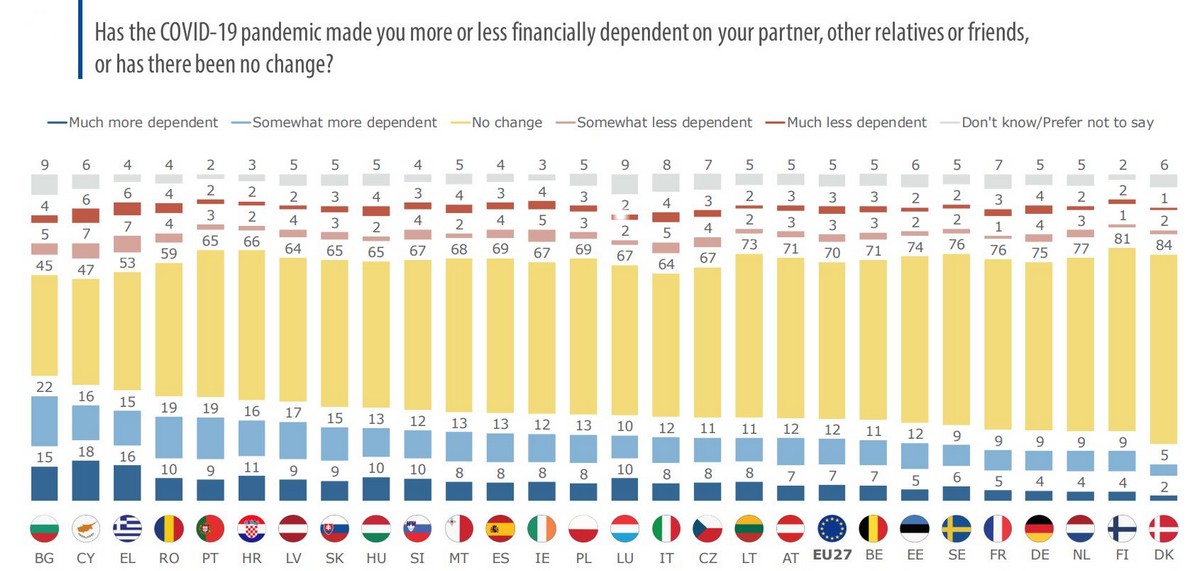 Πρόκειται για το 31% των Ελληνίδων γυναικών που, λόγω της πανδημίας απάντησαν ότι πλέον εξαρτώνται περισσότερο οικονομικά από τους συντρόφους τους (τρίτη η χώρα μας μετά από Βουλγαρία και Κύπρο), με τον ευρωπαϊκό μέσο όρο να εντοπίζεται στο 19%. Τι συμπεράσματα μπορούν, λοιπόν, να εξαχθούν από μία σύζευξη των δύο αυτών απαντήσεων;