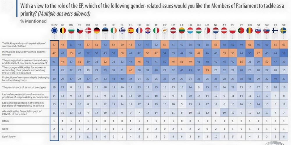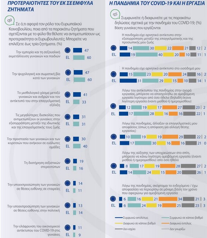 Το Ευρωβαρόμετρο του ΕΚ, για πρώτη φορά, εξέτασε ένα μεγάλο εύρος ζητημάτων αναφορικά με τις επιπτώσεις της πανδημίας στην έμφυλη βία, την ψυχική υγεία και την εργασία των γυναικών, καθώς και τη δική τους ιεράρχηση ως προς τις προτεραιότητες του Ευρωπαϊκού Κοινοβουλίου για την αντιμετώπιση των προβλημάτων που εντάθηκαν την τελευταία διετία. Ωστόσο, σε μία επόμενη έρευνα αντίστοιχου περιεχομένου, θα είχε ιδιαίτερο ενδιαφέρον να δούμε ένα πιο διευρυμένο ερωτηματολόγιο, με πολυδιάστατη συμμετοχή και περισσότερες κατηγοριοποιήσεις. Επίσης, ενώ υπήρξε ερώτηση για το πού θα απευθυνθούν οι ερωτηθείσες σε περίπτωση που αντιμετωπίσουν προβλήματα ψυχικής υγείας, δεν ρωτήθηκαν κάτι αντίστοιχο για την περίπτωση που πέσουν θύματα βίας.