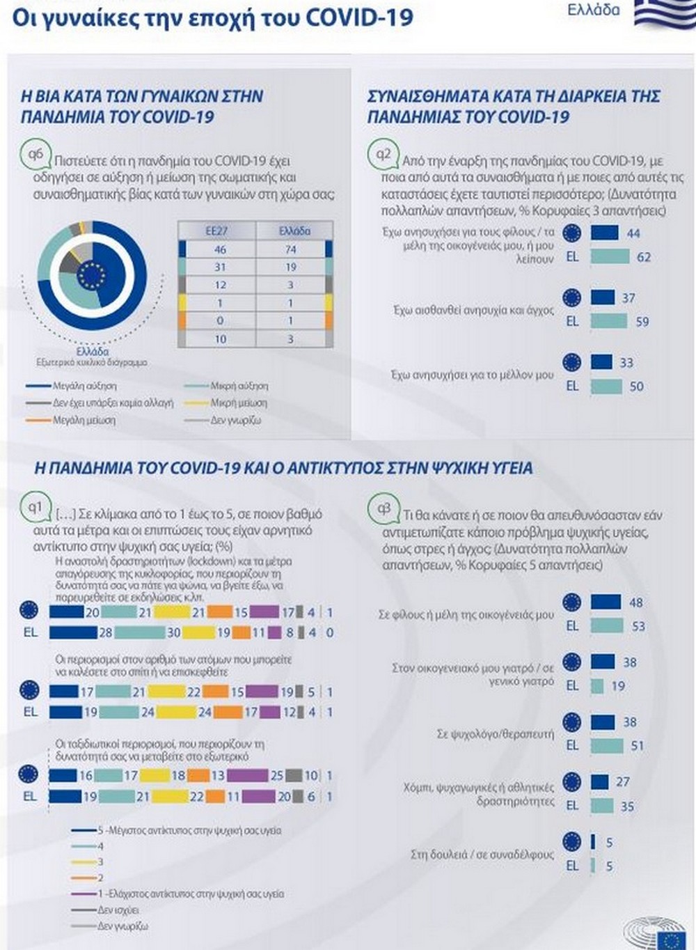 Οι Ελληνίδες συγκέντρωσαν πολύ υψηλότερα ποσοστά στις αντίστοιχες κατηγορίες, με το 62% να αναφέρουν το φιλικό και οικογενειακό περιβάλλον, το 59% την αίσθηση άγχους και στρες, το 50% την ανησυχία για το μέλλον, ενώ πάνω από τις μισές Ελληνίδες ερωτηθείσες (54%) δήλωσαν πως αισθάνθηκαν εγκλωβισμένες στο σπίτι λόγω των περιορισμών, διαφοροποιώντας τα αποτελέσματα της Ελλάδας από τον ευρωπαϊκό μέσο όρο (30%). Διόλου ευκαταφρόνητο και το 40% (έναντι 29%) που δήλωσαν ότι αισθάνθηκαν μοναξιά και απομόνωση στο σπίτι.