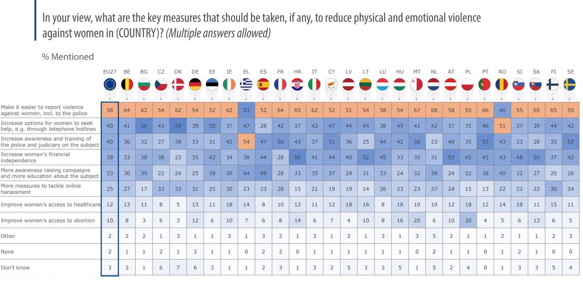 Ιδιαίτερο ενδιαφέρον παρουσιάζουν και οι απαντήσεις ως προς τα βέλτιστα και αναγκαία μέτρα που θα πρέπει να ληφθούν για να περιοριστεί η βία κατά των γυναικών. Το 58% των Ευρωπαίων γυναικών που συμμετείχαν ζητά διευκόλυνση των καταγγελιών, ειδικά στην αστυνομία, με την Ελλάδα να ακολουθεί το υψηλό ποσοστό (με 53%), αν και οι περισσότερες Ελληνίδες (54%) ζητούν αυξημένη επαγρύπνηση και κατάλληλη εκπαίδευση των αστυνομικών και δικαστικών αρχών (στο 40% ο ευρωπαϊκός μέσος όρος). Πολύ ψηλά κυμάνθηκε και το αίτημα για περισσότερες δυνατότητες έκκλησης για βοήθεια (όπως τηλεφωνικές γραμμές), απάντηση που έδωσε το 47% των Ελληνίδων και το 40% των συμμετεχουσών από την Ε.Ε. Αξιοσημείωτο και το ελληνικό 44% (έναντι 33% του ευρωπαϊκού μ.ο) για περισσότερες εκπαιδευτικές εκστρατείες γύρω από το θέμα.