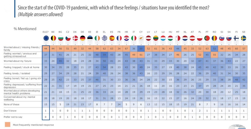 Από την αρχή της πανδημίας, τα συχνότερα συναισθήματα που νιώθουν οι γυναίκες είναι ότι ανησυχούν ή ότι τους λείπουν φίλοι και συγγενείς (44%), ότι έχουν άγχος και στρες (37%) και ότι ανησυχούν γενικώς για το μέλλον τους (33%).