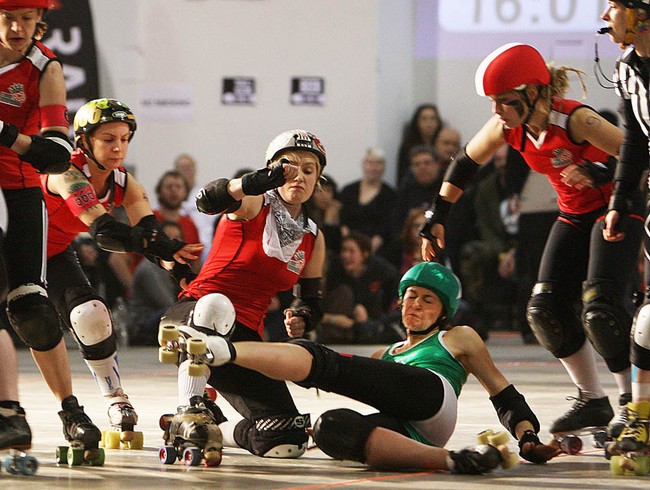 TORONTO, ON: DECEMBER 2, 2011--A team Ireland player (GREEN) wipes out against her team England (RED) counterparts during their bout at the Roller Derby World Cup at Toronto's Downsview Park, Friday December 2, 2011. The competition continues thru till Sunday when the first Roller Derby World Cup will be handed out to the winner. (Peter J. Thompson/National Post) (Story by Peter Kuitenbrouwer/National Post/Toronto) //NATIONAL POST STAFF PHOTO Peter J. Thompson