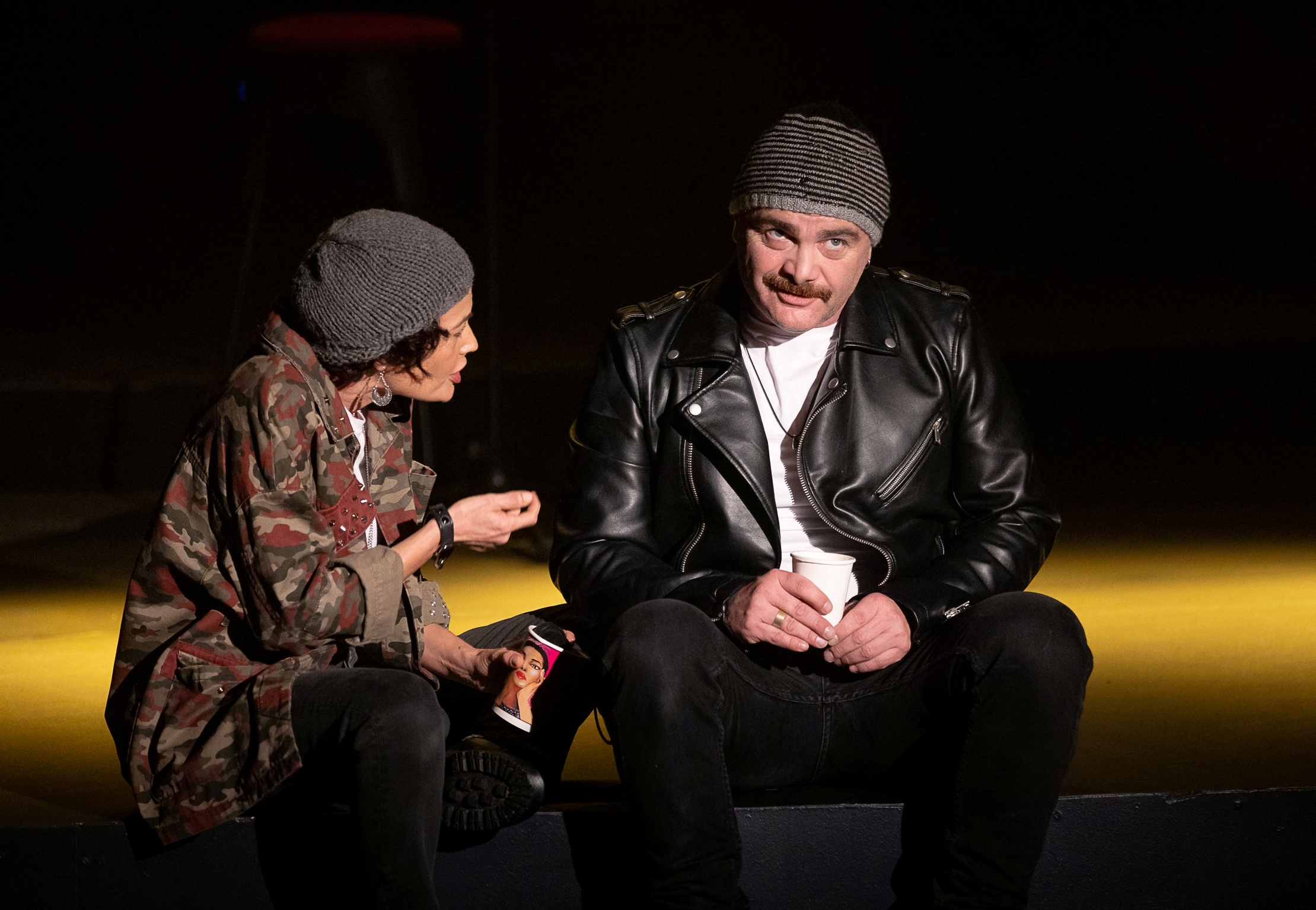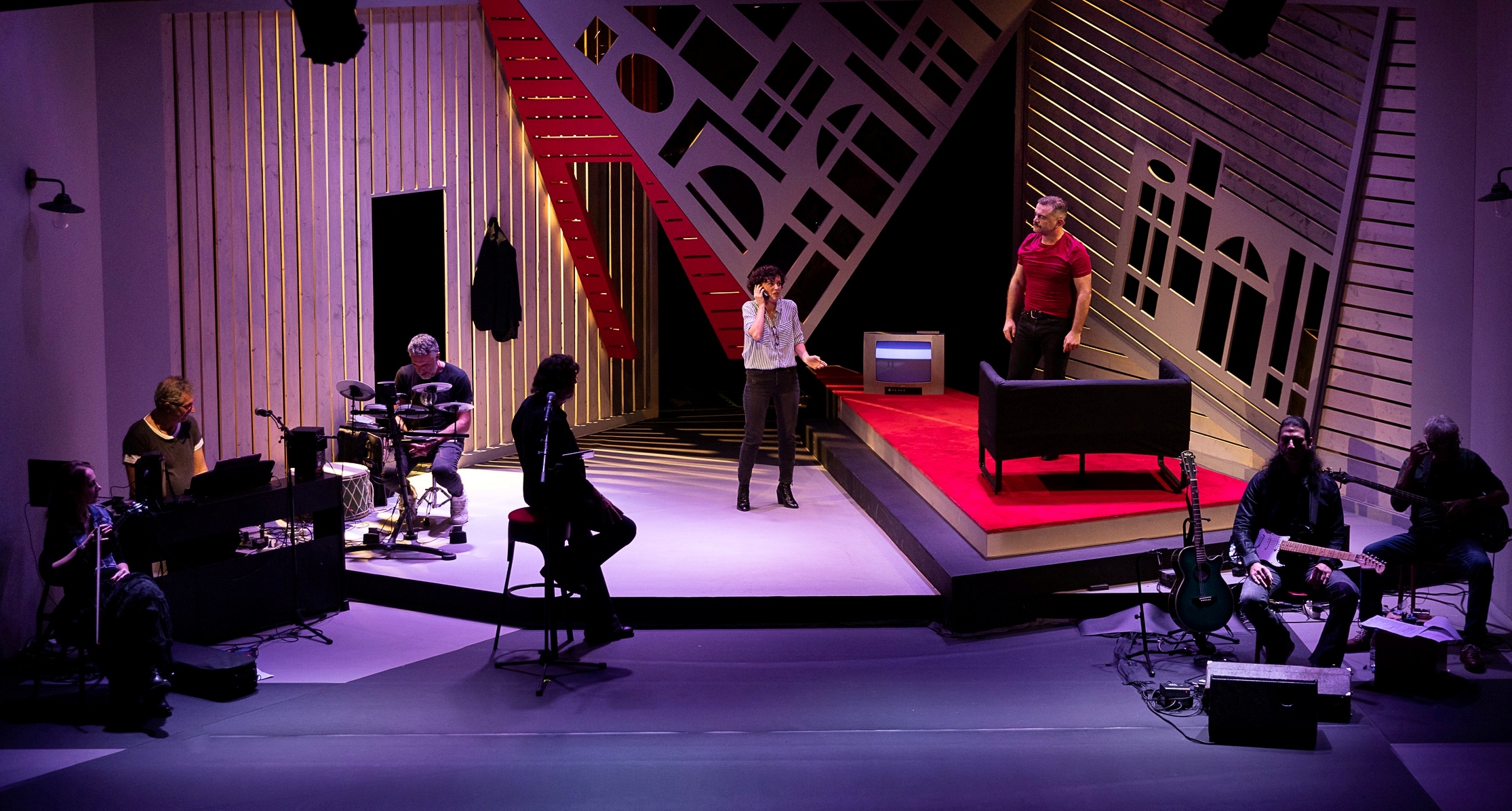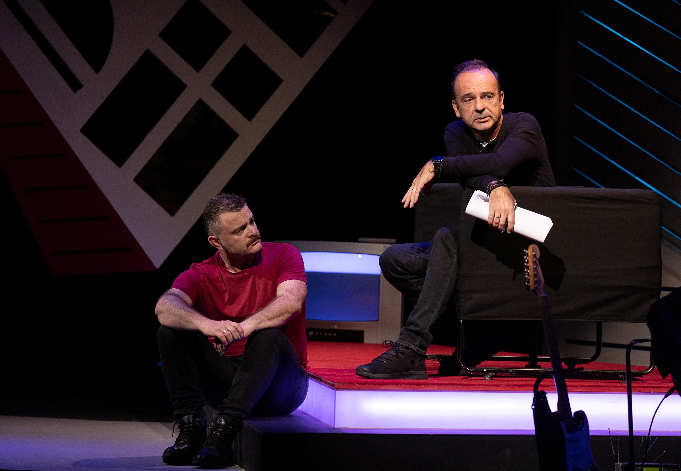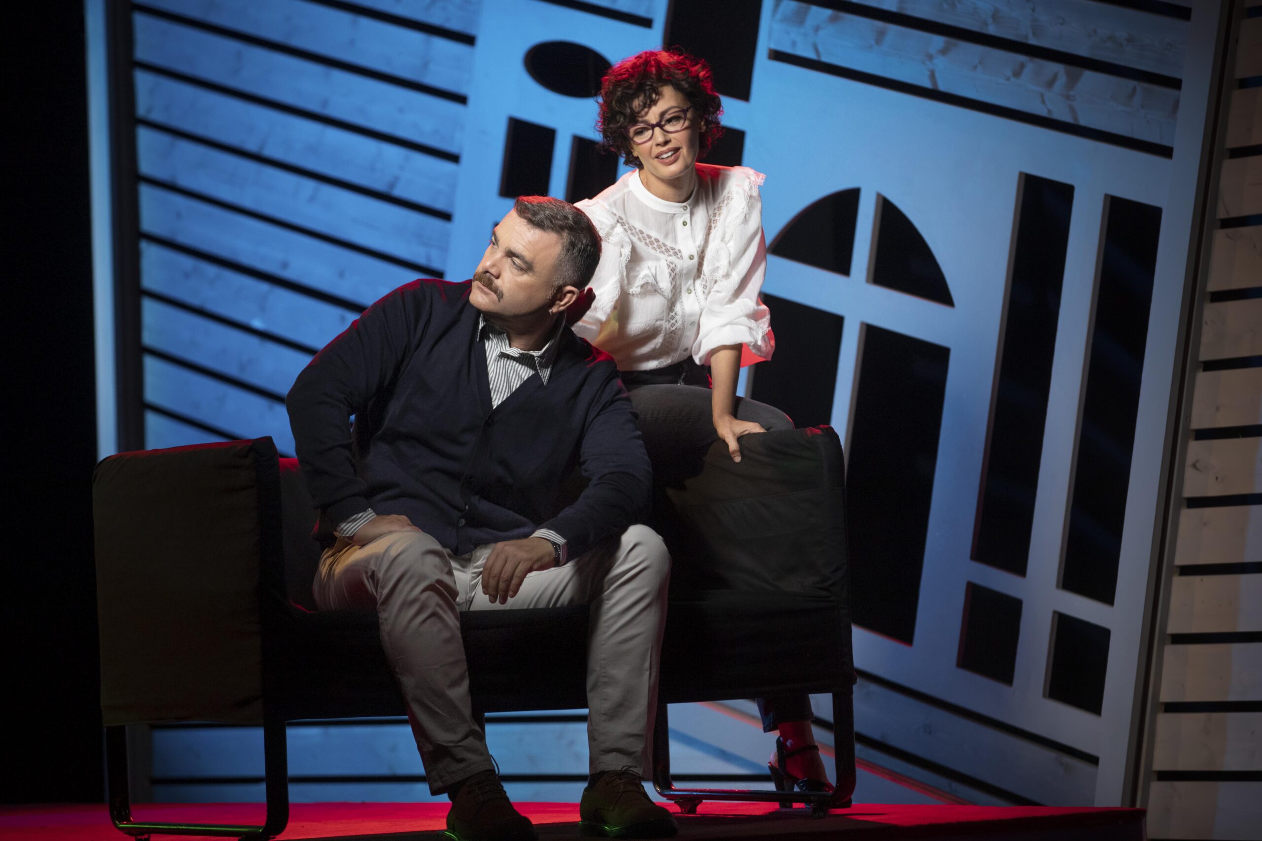 Δίπλα της – και ενίοτε απέναντί της – ένας εξίσου “ζωντανός” Δημήτρης, ακόμα και στην “κουρασμένη” του εκδοχή, παγιδευμένος στα τσακισμένα του όνειρα, εγκλωβισμένος στην ανία της ρουτίνας και απελπισμένος μέσα στα όρια και τους περιορισμούς της κοινής ησυχίας, δένει τη μελαγχολία και την εσωτερική του παρακμή, μετρώντας τις αντοχές του με “κραδασμούς” που αντηχούν σε όλη τη σκηνή τα προσωπικά του αδιέξοδα. Και η δική του ταύτιση με τον ρόλο, είναι ένα κοινό στοιχείο με τη Σοφία.