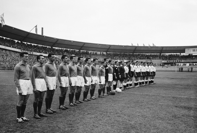Γαλλία και Γερμανία στην σέντρα του μικρού τελικού το 1958. Όγδοος από αριστερά ο Ζιστ Φοντέν AP