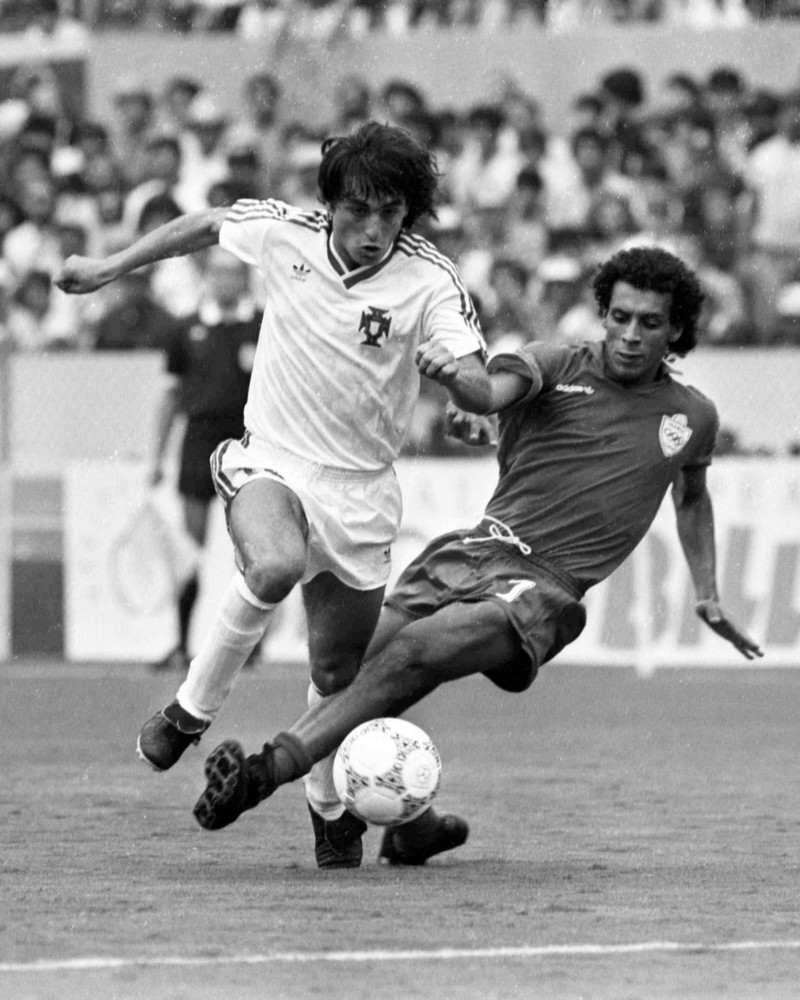 Ο Μουσταφά Ελ Μπιτάζ μαρκάρει τον Πάολο Φούτρε από το ιστορικό 3-1 του Μαρόκου κόντρα στην Πορτογαλία το 1986 AP