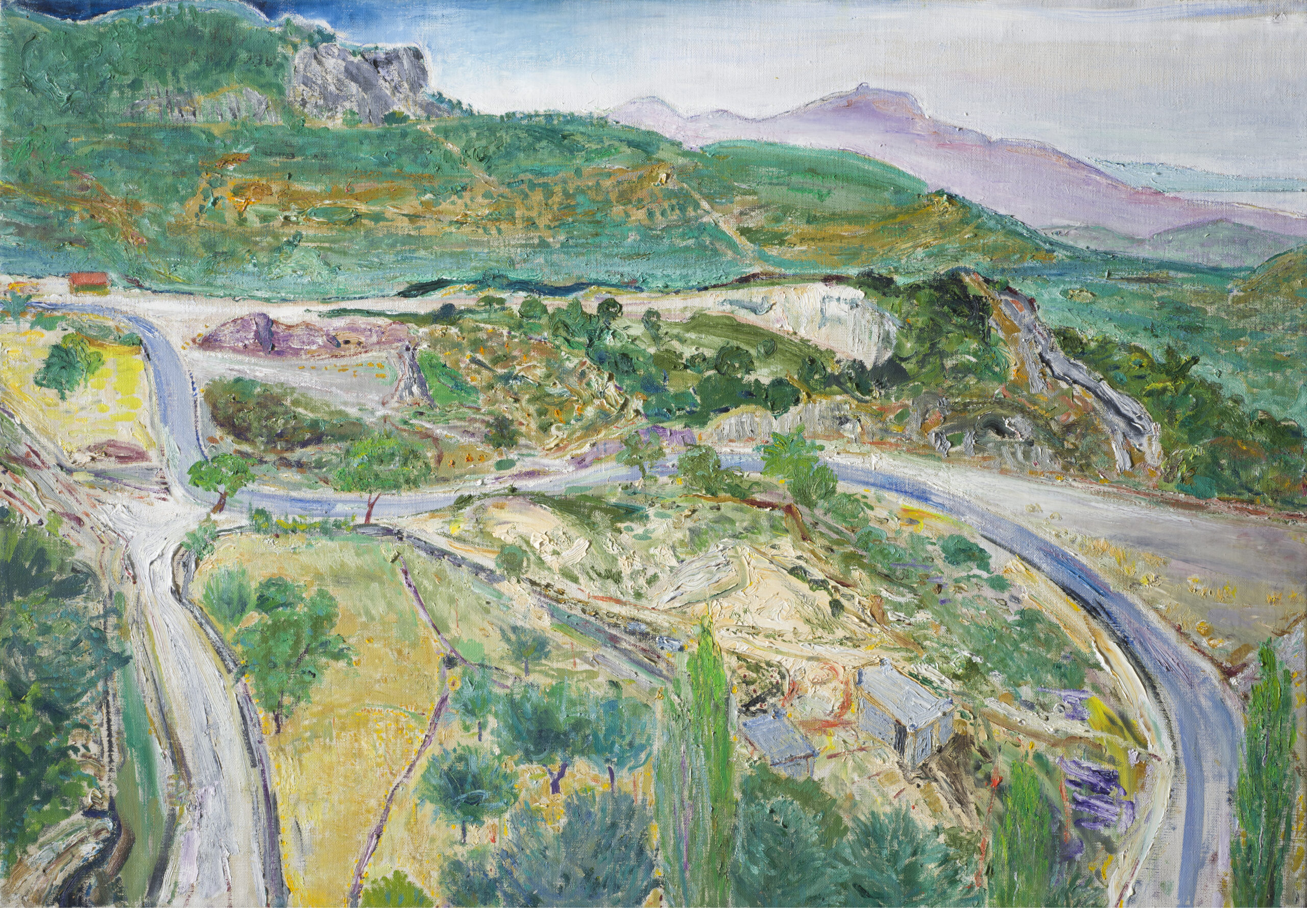100 έργα βρίσκονται στην Άνδρο που καλύπτουν τις χρονολογίες από το 1953 έως το 2018. Οι ενότητες δεν είναι ακριβώς χρονολογικές. Στον πρώτο όροφο του Μουσείο Σύγχρονης Τέχνης θα βρείτε τα “Τοπία”. Αργεί αρκετά να το κάνει αφού τα έργα ανήκουν στην έβδομη δεκαετία της ζωής του. Εμπνέεται από τον Cézanne και θα βρει το δικό του όρος Σαιντ-Βικτουάρ στο Πετρί της Λέσβου. Από τα παράθυρα του οικογενειακού σπιτιού, έρχεται αντιμέτωπος με τους γύρω λόφους και γίνεται αρχιτέκτονας του βράχου. Έχει πολύ ενδιαφέρον η τοποθέτηση των έργων στο μόνο χώρο του μουσείου που έχει φυσικό φως και πώς τα τοπία του Μπότσογλου δένουν αρμονικά με το φυσικό σκηνικό γύρω από τη χώρα της Άνδρου.