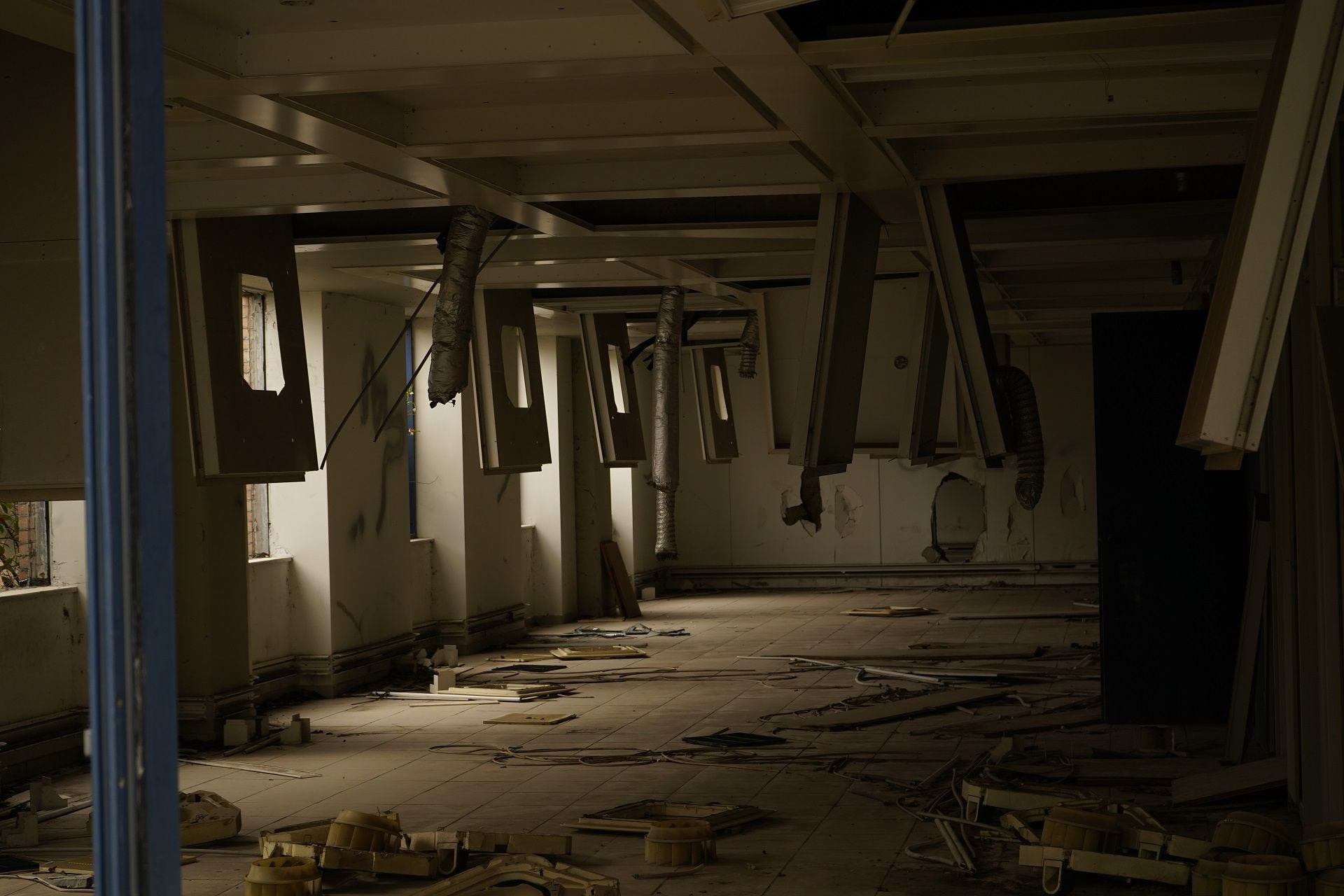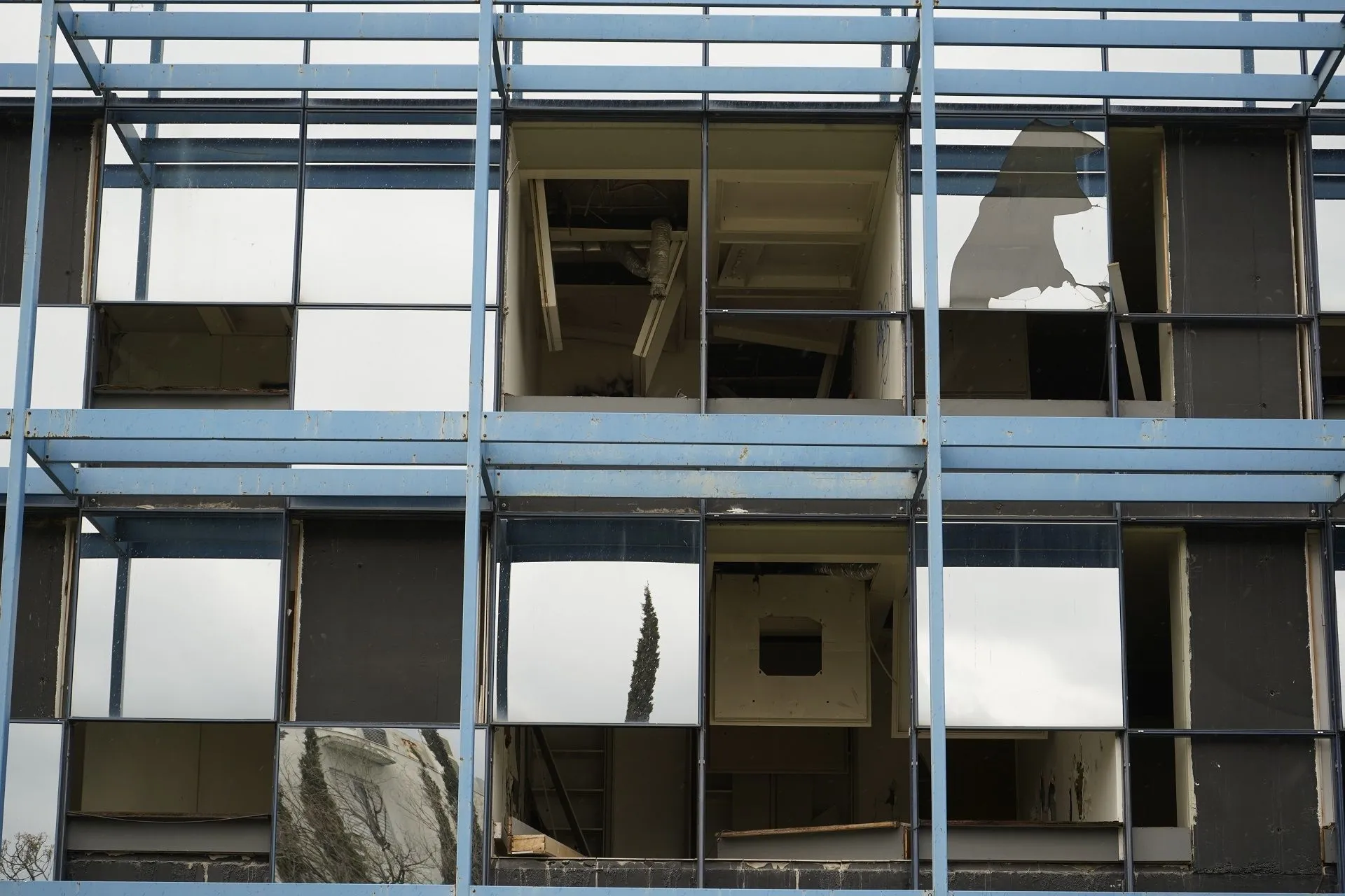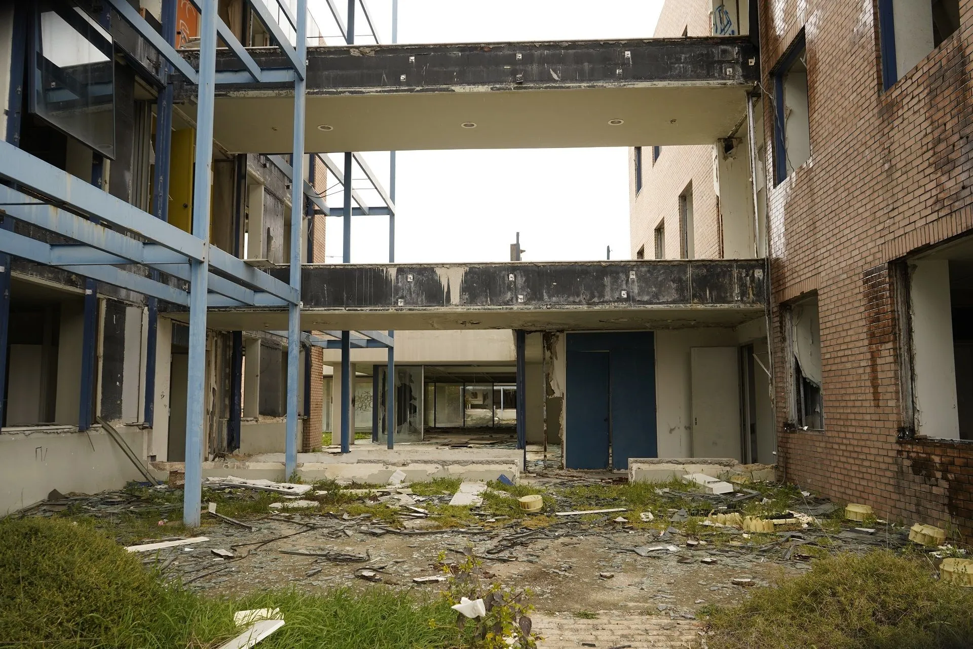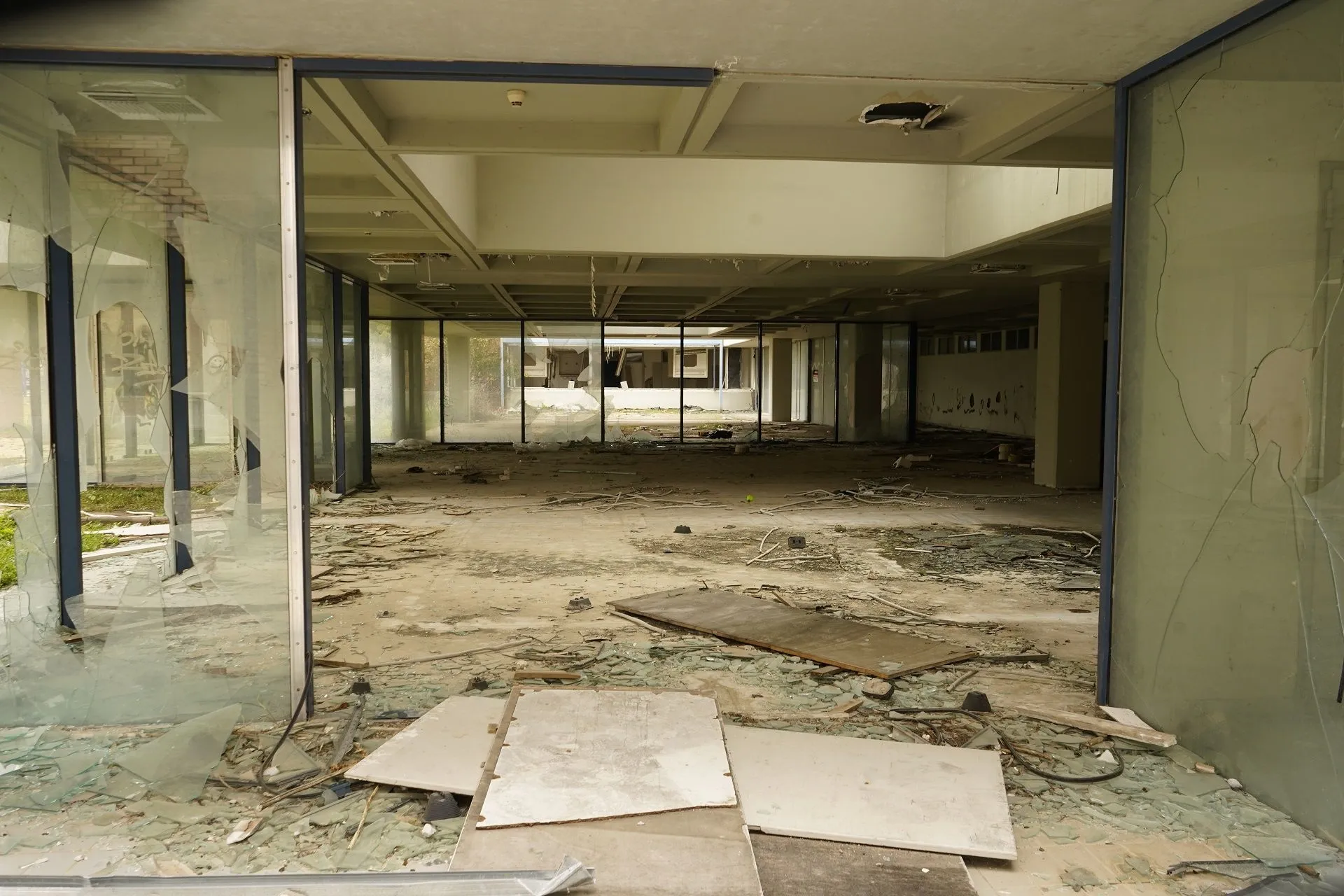 Σε κάθε τετραγωνικό απλώνεται ένα χαλί από σπασμένα τζάμια, αποτελώντας ίσως το τελευταίο στοιχείο που μπορεί να κάνει τον επισκέπτη να φανταστεί την εντυπωσιακή εικόνα που κάποτε θα είχε το κτήριο με την γυάλινη πρόσοψη. Ισχνό φάντασμα αυτού, η γέφυρα που συνδέει τα δύο οικόπεδα και είναι η μόνη που έχει μείνει φαινομενικά ανέγγιχτη.