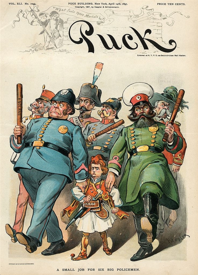 “Μια εύκολη υπόθεση για έξι μεγάλους αστυνομικούς”. Αυτή είναι η λεζάντα στην γελοιογραφία που φιλοξενούσε στο εξώφυλλο του σατυρικού αμερικανικού περιοδικού Puck στις 14 Απριλίου 1897. Ως μικρός ταραξίας εμφανίζεται η Ελλάδα η οποία περιβάλλεται από έξι αστυνομικούς που αντιπροσωπεύουν τα κράτη: Μεγάλη Βρετανία, Γαλλία, Ρωσία, Γερμανία, Ιταλία και Αυστρία. Τι ακριβώς απεικονίζει το σκίτσο;