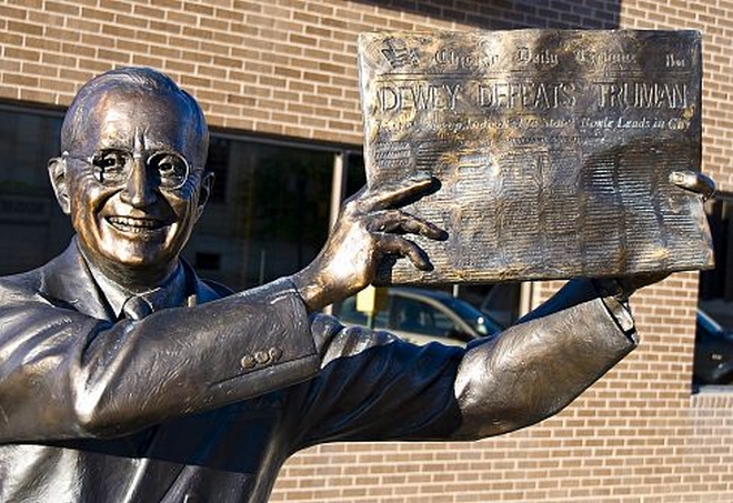 Chicago Daily Tribune υπήρχε σταθερά όλη την προεκλογική περίοδο μία απαξιωτική στάση απέναντι στον υποψήφιο των Δημοκρατικών. Εκείνο όμως το βράδυ ο τίτλος έπρεπε να βγει κάποιες ώρες νωρίτερα εξαιτίας μίας απεργίας των τυπογράφων. Τα πρώτα φύλλα θα έπρεπε να φύγουν για τις Δυτικές Ακτές και ο χρόνος πίεζε. Οι επιλογές ήταν δύο: ή ένας γενικόλογος τίτλος που θα είχε ξεπεραστεί από τα γεγονότα ή ένας ξεκάθαρος που θα έφερνε την εφημερίδα μπροστά και από τον ανταγωνισμό με αποτέλεσμα τα αντίτυπα να φεύγουν σαν ζεστά κουλούρια. Με βάση την έως τότε αλάνθαστη πρόβλεψη των δημοσκοπήσεων επέλεξαν το δεύτερο με αποτέλεσμα τα πρώτα 150.000 φύλλα να κυκλοφορήσουν με τίτλο «Dewey Defeats Truman» (O Dewey επικράτησε του Truman).