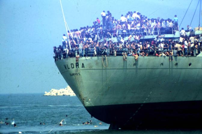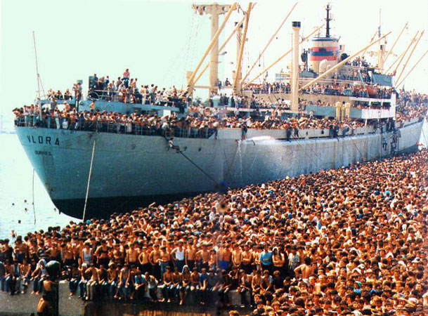 Λίγους μήνες αργότερα στην Ιταλία θα στηνόταν ένα σκηνικό που θα σόκαρε από την μαζικότητα του αλλά και την βαρβαρότητα των Ιταλών τον πλανήτη. Όλα ξεκίνησαν από ένα τρελό και παράτολμο σχέδιο που είχαν κάποιοι στο λιμάνι του Δυρραχίου στις 7 Αυγούστου του 1991. Το πλοίο Vlora (o Αυλώνας στα αλβανικά) είχε δέσει για να ξεφορτώσει 10.000 τόνους ζάχαρη από την Κούβα .Σε μία κίνηση απελπισίας στο πλοίο άρχισαν να ανεβαίνουν απελπισμένοι Αλβανοί που μη έχοντας τι άλλο να κάνουν συγκεντρώνονταν κάθε ημέρα στο λιμάνι. Ο πραγματικός αριθμός των ανθρώπων που στοιβάχτηκαν άγνωστος. Οι πιο συντηρητικοί υπολογισμοί τους αναφέρουν στις 10.000 κάποιοι άλλοι τους ανεβάζουν στις 15.000 και κάποιοι άλλοι στις 20.000.
