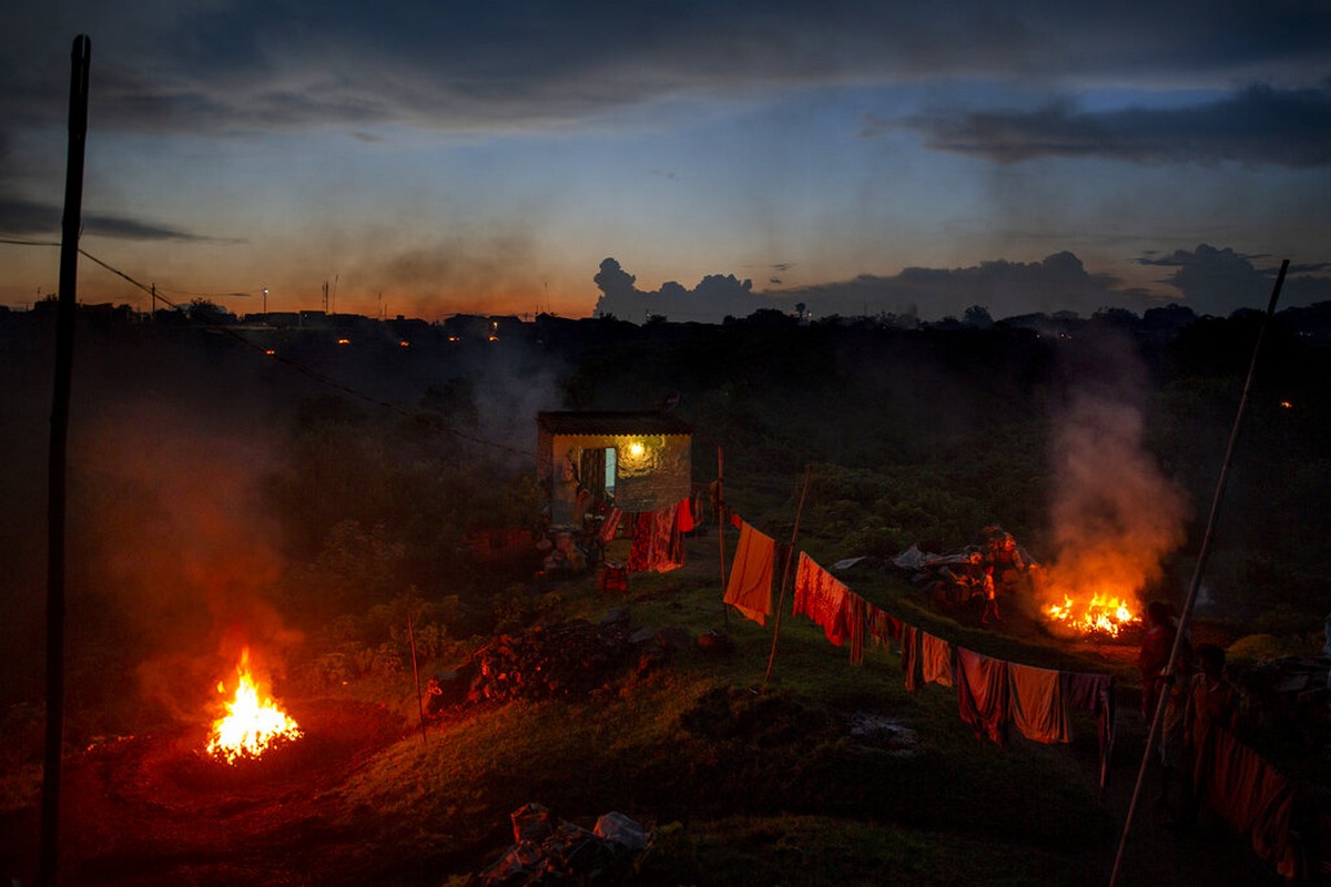 Ένα αγόρι στέκεται πλάι σε μια μικρή στοίβα άνθρακα που καίγεται AP