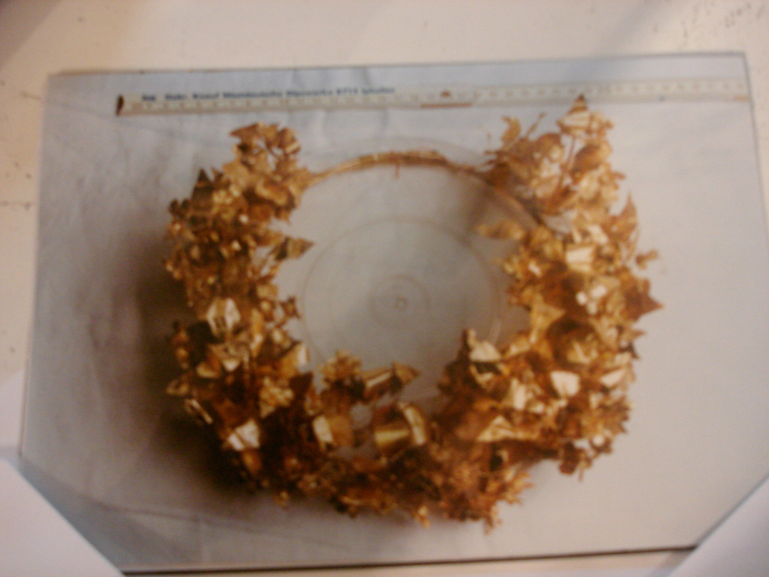 Για την επιστροφή του χρυσού μακεδονικού στεφανιού μυρτιάς με χρωματιστά άνθη από σμάλτο, εξαιρετικό δείγμα μακεδονικής χρυσοχοϊκής τέχνης του 4ου αι π Χ, ο δρόμος ήταν πιο δύσβατος και χρονοβόρος. “Μέσα στο αρχείο του Μπεκίνα, το οποίο ήρθε στα χέρια μου σπαστά, σε διαφορετικά χρονικά σημεία, εμφανιζόταν το χρυσό στεφάνι που ήταν εκτεθειμένο στο Μουσείο Γκετί. Η φωτογραφία του όμως δεν ήταν ούτε καθαρή, ούτε polaroid. Ήταν φωτογραφία από φωτογραφία και το στεφάνι ήταν πολύ σκούρο και δυσδιάκριτο, άρα δεν μπορούσε να αποτελέσει αποδεικτικό στοιχείο, παρά μόνο συμπληρωματικό. Αργότερα, και ενώ η διαπραγμάτευση με τους εκπροσώπους του Γκετί είχε ήδη ξεκινήσει στο Υπουργείο Πολιτισμού και με τους δικηγόρους του μουσείου να ζητούν περισσότερα αποδεικτικά στοιχεία, συνάντησα έναν αστυνομικό, ο οποίος μου έδωσε μια δικογραφία από τη Γερμανία.
