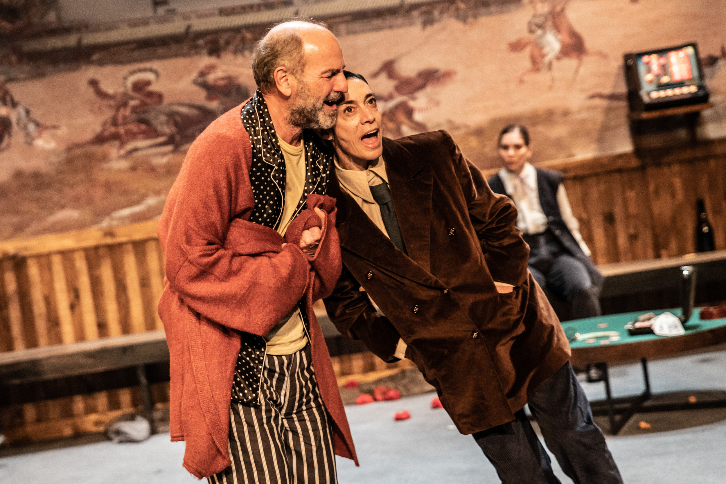 “Είναι σαν να έχει νικήσει τον θάνατο, επειδή έχει προκαλέσει θάνατο και επειδή ο ίδιος ξέρει ότι θα πεθάνει αύριο. Είναι σαν να έχει κάνει μια υπερβατική πράξη και νιώθει όλα τα αισθήματα πολύ έντονα και συνέχεια δηλαδή. Δεν ξέρω αν συμφωνείς Ακύλλα” λέει η Έ.Τοπαλίδου κοιτάζοντας τον Α. Καραζήση που με τη σειρά του απαντά “συμφωνώ απολύτως. Απλώς μην ξεχνάμε και το τι ήταν αυτός πριν διαπράξει τον φόνο. Είναι κάποιος, ο οποίος ζει με τον ίδιο τρόπο, αλλά σε αντίθεση με αυτούς δουλεύει. Είναι πλασιέ, πουλάει, συναλλάσσεται με τον κόσμο. Αγαπάει με πάθος τη δουλειά του. Και έρχεται εδώ στο μπαρ και ξεθυμαίνει. Το ενδιαφέρον είναι έρχεται αλλαγμένος και απαιτεί και από τους άλλους να αλλάξουν”.