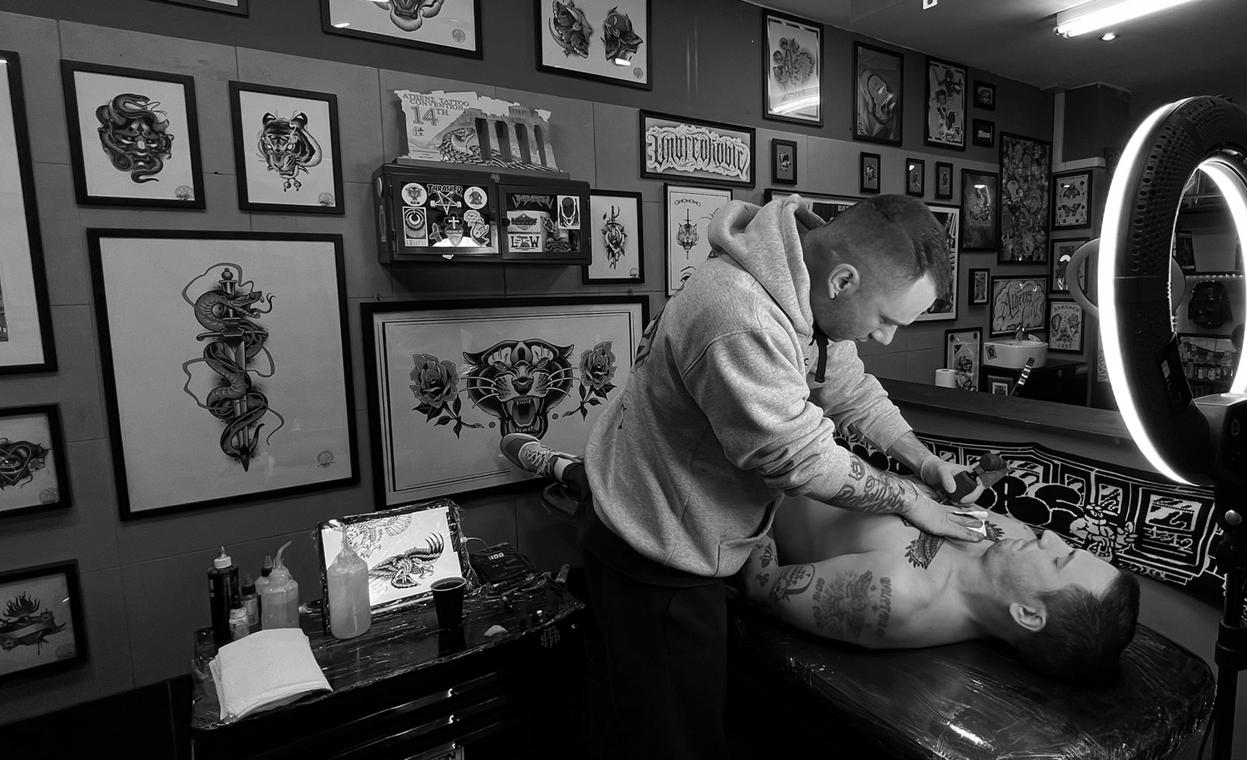 Η διαδικασία του tattoo χρειάζεται συγκέντρωση, καλή επικοινωνία αλλά και εμπιστοσύνη μεταξύ artist και πελάτη – κι όταν αυτή η συνθήκη λειτουργεί επιφέρει το καλύτερο αποτέλεσμα. Alex Gotza