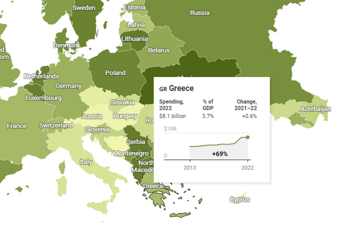 Στη φωτογραφία με την Ελλάδα, θα διάβασες πως σημειώθηκε αύξηση της τάξεως του 69% στις αγορές όπλων που έκανε η χώρα από το 2013 έως το 2022. Ξοδέψαμε προς αυτήν την κατεύθυνση 8.100.000.000 δολ.