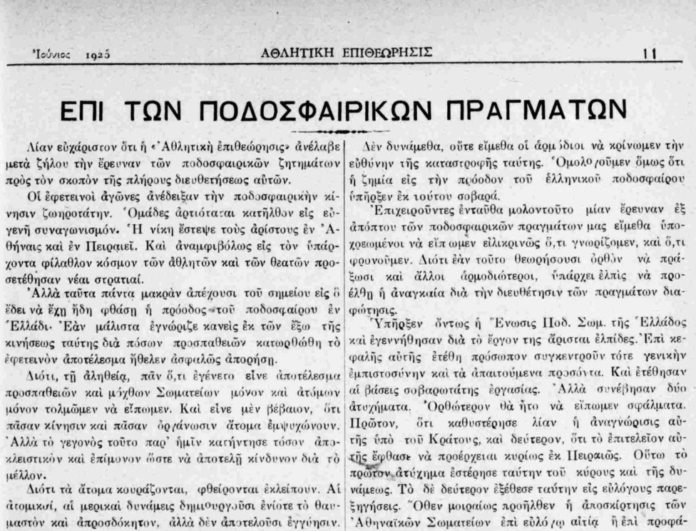 Στο τεύχος του Ιουνίου 1925, της μηνιαίας “Αθλητικής Επιθεώρησης”, ένα πρωτοποριακό περιοδικό του πιονιέρου του αθλητισμού και της αθλητικής δημοσιογραφίας Κωνσταντίνου Ρουμπέση, ο Νότης Καμπέρος, αρθρογραφεί και είναι καταπελτώδης.