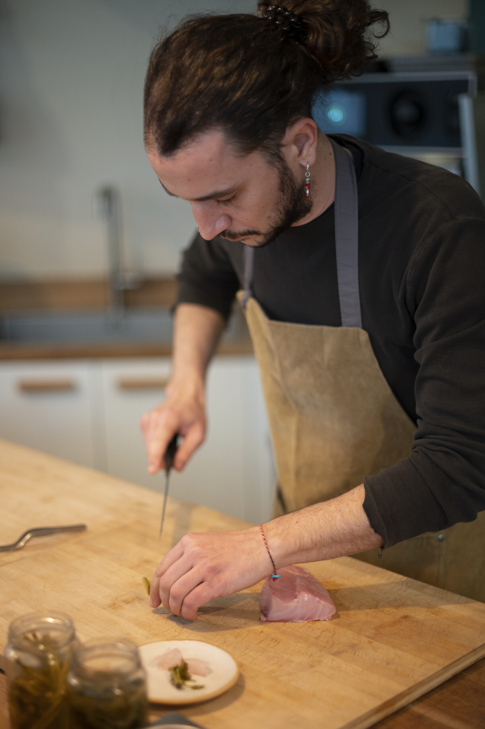 “Μαγειρεύω για τα κρασιά μου. Νομίζω ότι συνδυάζονται ιδανικά τόσο με ψάρι όσο και με κρέας” τονίζει και η αλήθεια είναι ότι υπάρχει μία ελευθερία στο ταίριασμά τους – η ίδια που διακατέχει και τον ίδιο στον τρόπο ζωής αλλά και τη μαγειρική του. Ο συνδυασμός της διττής ιδιότητας, αυτή του μάγειρα αλλά και του αμπελουργού τού δίνει το προβάδισμα, να παντρεύει γεύσεις και υλικά και στο τέλος να παρουσιάζει μια κουζίνα ενδιαφέρουσα και με ταυτότητα.