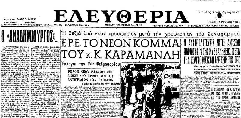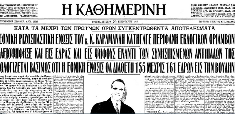 Ήταν 19 Φεβρουαρίου του 1956, όταν οι Έλληνες -και για πρώτη φορά οι Ελληνίδες- πήγαιναν στις κάλπες για να ψηφίσουν σε μια εκλογική διαδικασία που έμεινε στην ιστορία. Όχι τόσο για τους δυο βασικούς μονομάχους τη νεοσύστατη υπό τον Κωνσταντίνο Καραμανλή ΕΡΕ και τη Δημοκρατική Ένωση έναν ευρύτατο συμμαχικό σχηματισμόςμε δυνάμεις του Κέντρου και την Ενιαία Δημοκρατική Αριστερά, αλλά επειδή το κόμμα που ήρθε δεύτερο σε ψήφους, συγκέντρωσε την απόλυτη πλειοψηφία σε έδρες στη Βουλή!