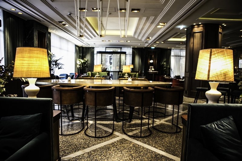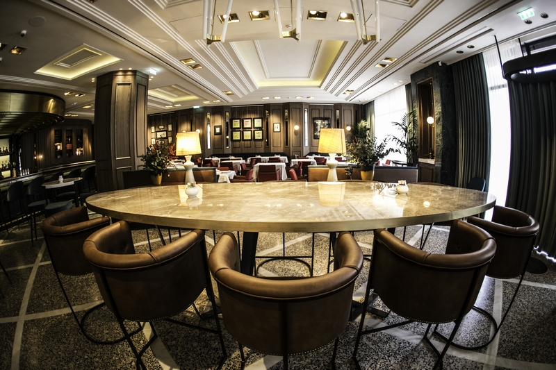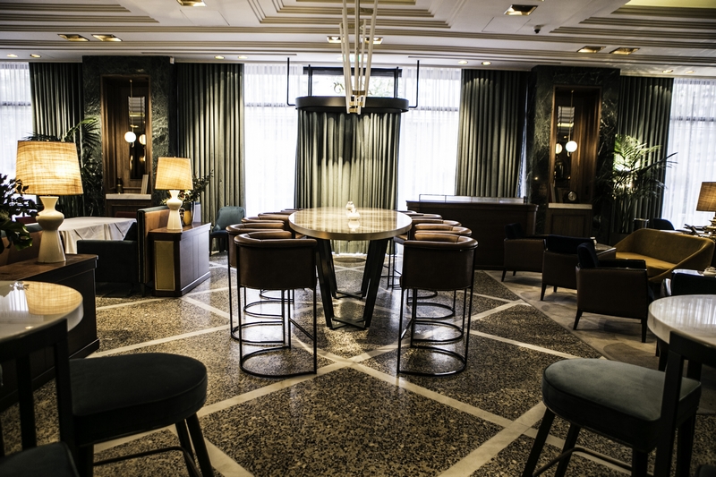 Μια πρώτη εντύπωση του χώρου: υπάρχουν τέσσερις νοητές ενότητες με διαφορετικό χαρακτήρα. Οι καπνίζοντες και αυτοί που θέλουν να έχουν άμεση οπτική επαφή με τη ζωή στην Πανεπιστημίου κάθονται έξω, όπου είναι και ο μόνος χώρος που επιτρέπεται το κάπνισμα. Αφού περάσει κανείς το κατώφλι, εισέρχεται σε μια άλλη πιο «ιδιωτική» ζώνη χαλαρή μουσική, σωστό φωτισμό, ξύλινες επενδύσεις στους τοίχους, μωσαϊκό στο δάπεδο, κουρτίνες στην τζαμαρία και όμορφα έπιπλα με έναν τόνο sixties. Αρχικά υπάρχει ένα lounge με αναπαυτικές πολυθρόνες, στο αριστερό μέρος ακολουθεί η μεγάλη μπάρα και στο βάθος είναι τα τραπέζια για το φαγητό. Τα γκαρσόνια στροβιλίζονται με χάρη και όπως είναι φυσιολογικό για ένα ιστορικό μαγαζί που μόλις ξανάνοιξε τις πόρτες του, σφύζει από κόσμο.
