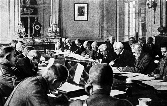 Ηγέτες και αξιωματούχοι όλων των κρατών – μεταξύ τους ο Ελευθέριος Βενιζέλος, δεύτερος από αριστερά στη δεξιά πλευρά του τραπεζιού – διαπραγματεύονται τους όρους της ειρηνευτικής συμφωνίας