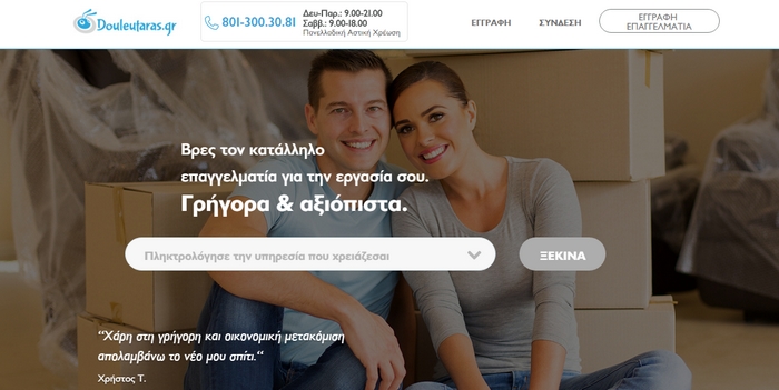 Έχεις αναρωτηθεί ποτέ πώς καταλήγεις να επιλέγεις υδραυλικό, ηλεκτρολόγο ή μαραγκό; Επίσης, πόσος καιρός απαιτείται για την πρόσληψη επαγγελματία οποιασδήποτε ειδικότητας για την επιχείρησή σου; Και πόσο εύκολα μπορείς να εμπιστευτείς την baby sitter που βρήκες online; Ο douleutaras.gr είναι εδώ για να σε πείσει πως η αξιοπιστία, η διαφάνεια, η αμεσότητα και η άριστη ποιότητα στις παρεχόμενες υπηρεσίες στην Ελλάδα, είναι απλά γεγονός!