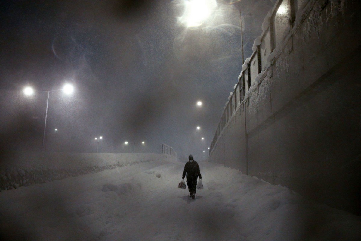 Γυναίκα οδηγός επιστρέφει στο αποκλεισμένο από τα χιόνια αυτοκίνητό της στην Αττική οδό, κουβαλώντας νερό και τροφή για την ίδια και τα παιδιά της (24.1.2022)