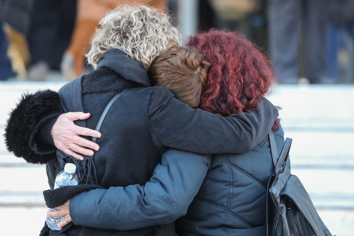Η μητέρα της δολοφονημένης Ελένης Τοπαλούδη βυθίζεται στην αγκαλιά των μανάδων της Γαρυφαλλιάς, που δολοφονήθηκε στη Φολέγανδρο, και της Ερατώς που δολοφονήθηκε στη Λέσβο, έξω από το Εφετείο όπου η υπόθεση δικάστηκε σε δεύτερο βαθμό (Αθήνα, 14.2.2022)