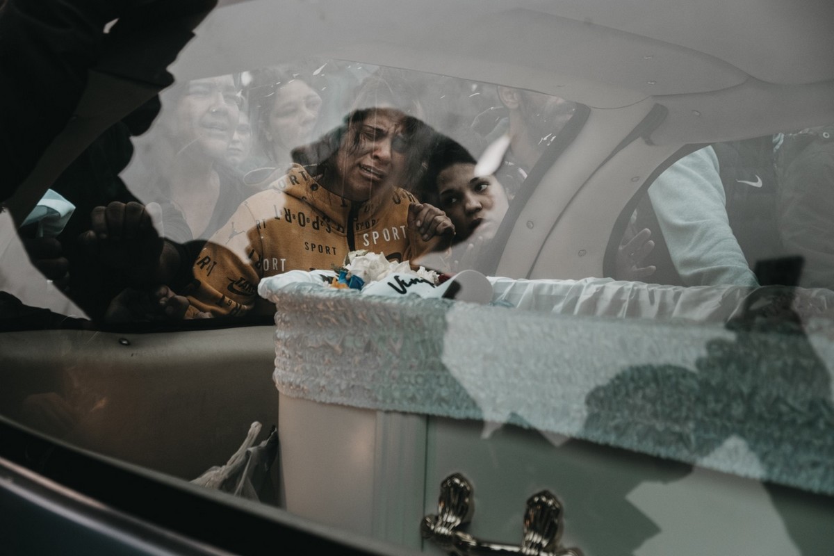 Συγγενείς του 16χρονου Κώστα Φραγκούλη, που έπεσε νεκρός από πυρά αστυνομικού, ακουμπούν στη νεκροφόρα κατά τη διάρκεια της κηδείας (15.12.2022)