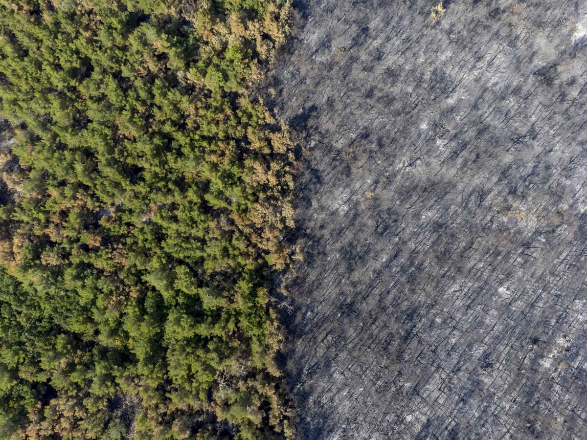 Εναέρια λήψη των καμένων δέντρων και ενός μέρος πράσινου στο Εθνικό Πάρκο Δάσους Δαδιάς (30.6.2022)