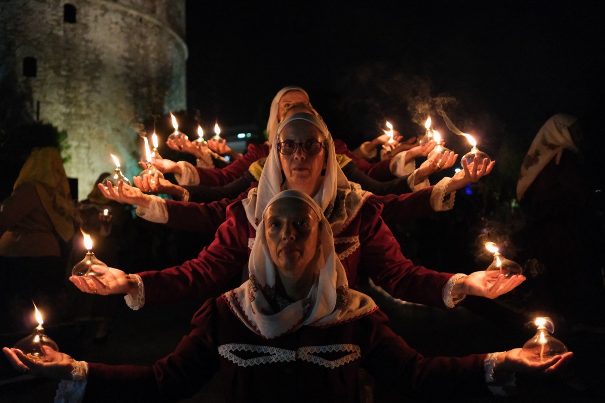 Φωτιές της Σμύρνης. Χορεύτριες σχηματίζουν σταυρό ενώ χορεύουν παραδοσιακό σμυρνέικο χορό για τα 100 χρόνια από την Μικρασιατική καταστροφή (1.9.2022)