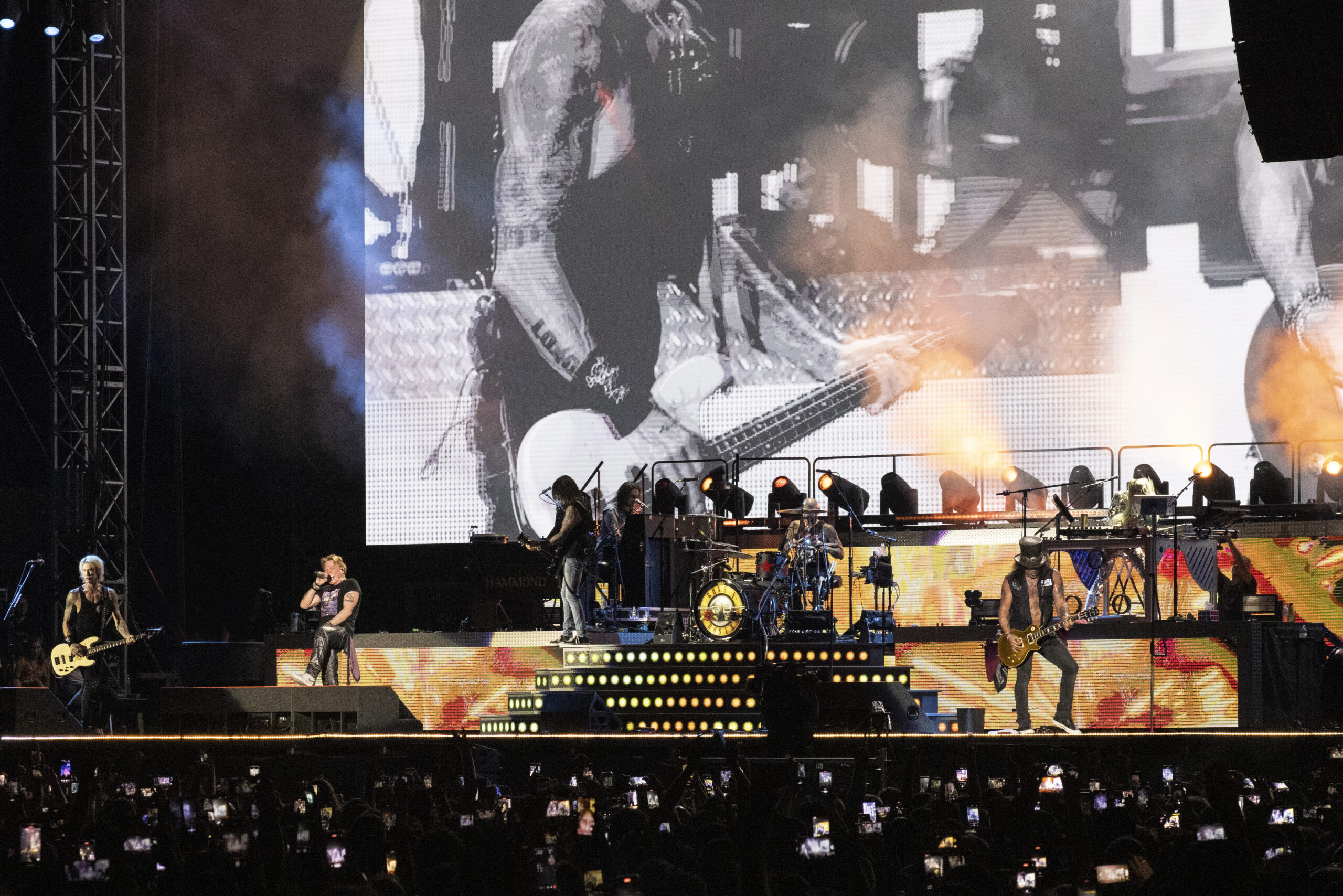 Μια θάλασσα κινητά σηκώθηκε στη φράση “Where do we go” και δεν χρειάστηκε να κατέβουν καν γιατί αμέσως ο Axl κάθισε στο πιάνο και ερμήνευσε την εμβληματική μπαλάντα “November Rain” εν μέσω ρομαντικής ψηφιακής βροχής.