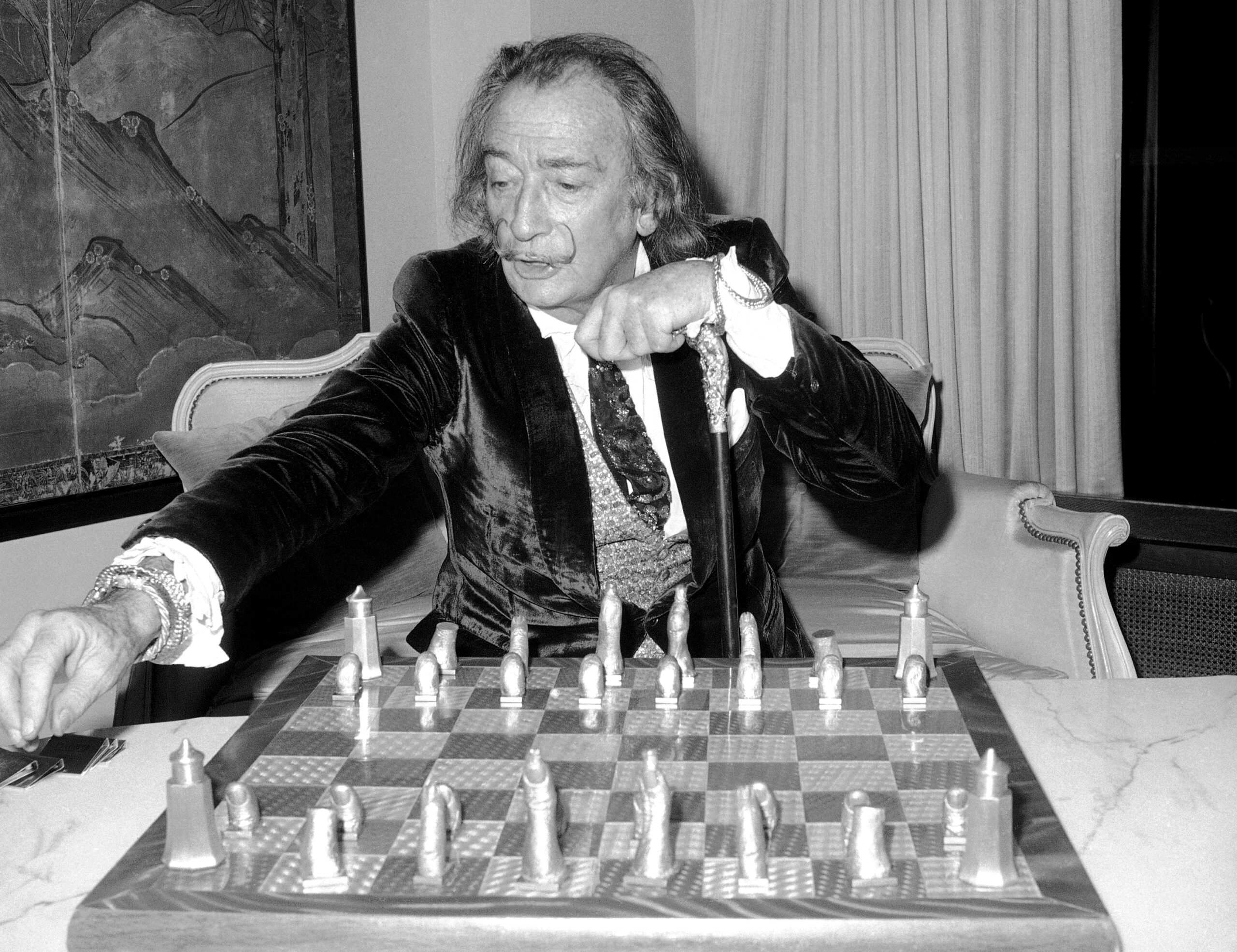 Ο Νταλί μπροστά σε μια σκακιέρα το 1971 στη Νέα Υόρκη. Όλα τα κομμάτια είναι σχεδιασμένα από τον καλλιτέχνη σύμφωνα με τα δάχτυλά του, εκτός από τις δυο βασίλισσες όπου χρησιμοποίησε τα δάχτυλα της Γκαλά και τους δυο πύργους που είναι αντίγραφα από τις αλατιέρες του ξενοδοχείου Saint Regis της Νέας Υόρκης. ⓒ 1971 Dave Pickoff/Associated Press