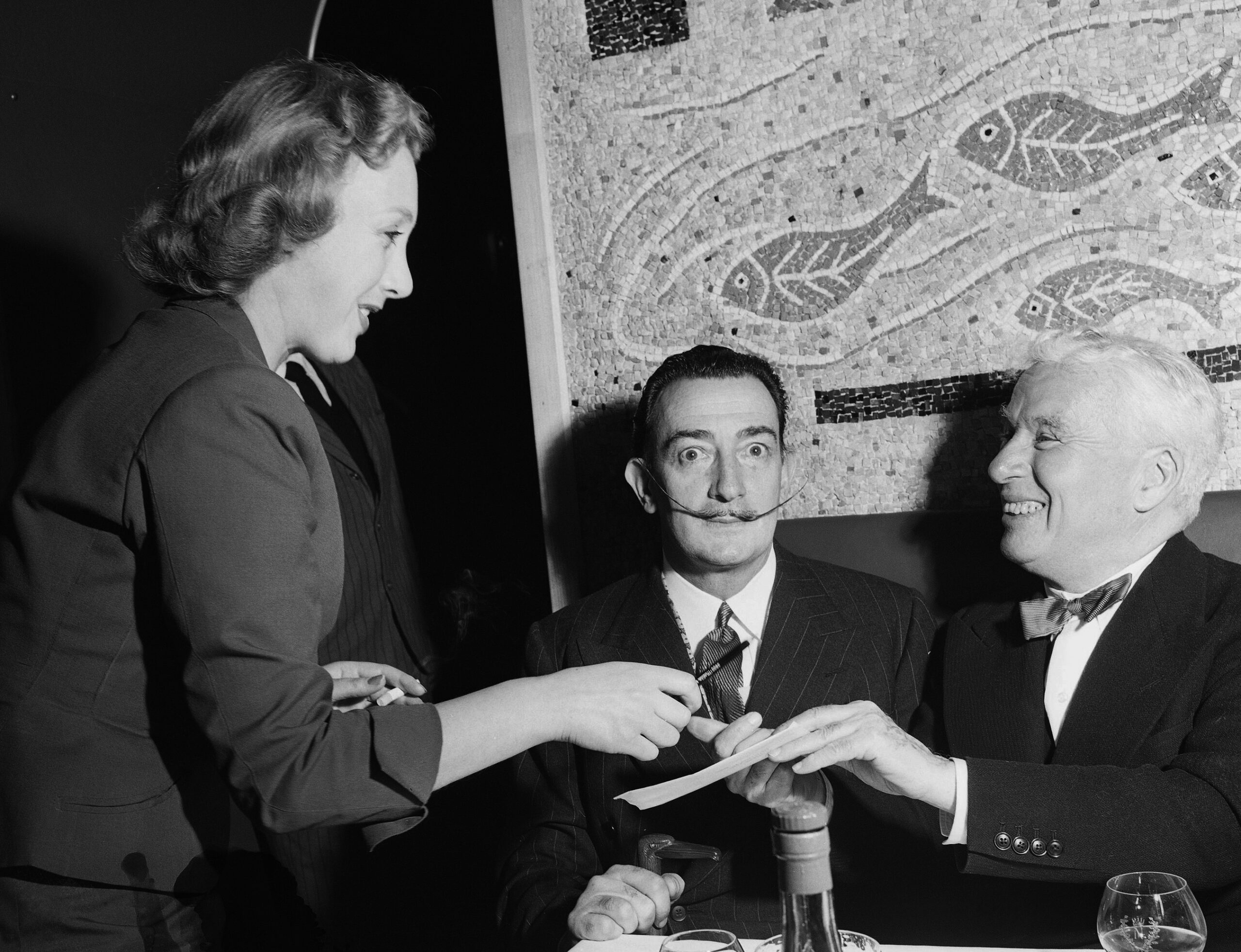 Ο Τσάρλι Τσάπλιν (δεξιά) δίνει ένα αυτόγραφο σε θαυμάστριά του, λίγο πριν δειπνήσει με τον Σαλβαδόρ Νταλί σε εστιατόριο της Ρώμης (1954). ⓒ 1954 Mario Torrisi/Associated Press