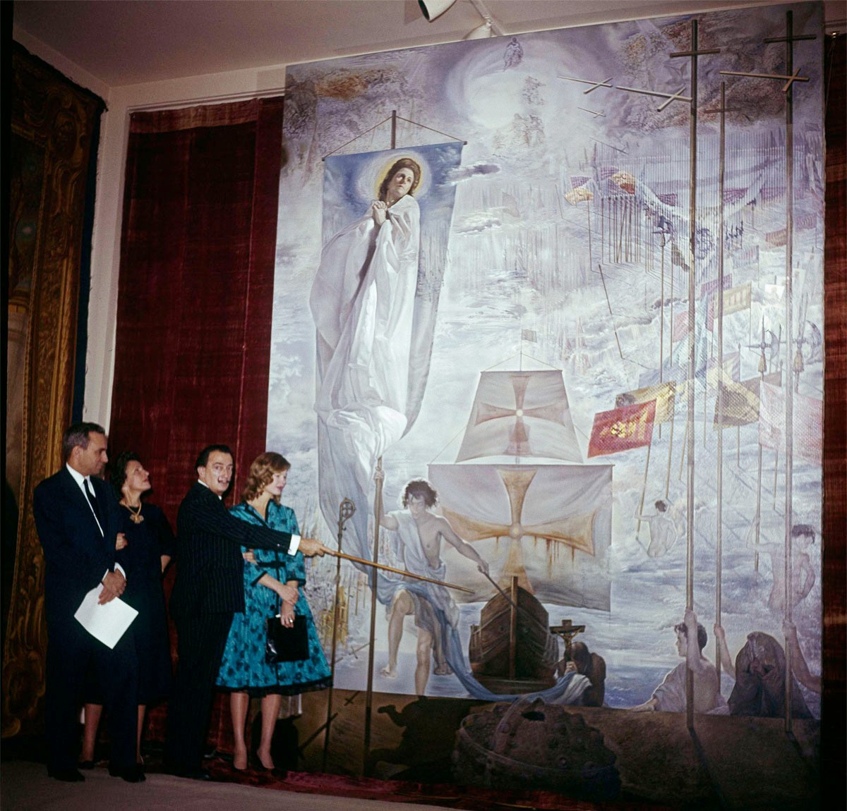 Ο Νταλί παρουσιάζει σε καλεσμένους του το έργο του, "Ο Κολόμβος ανακαλύπτει την Αμερική", το μεγαλύτερο σε μέγεθος που φιλοτέχνησε ποτέ (1960). ⓒ 1960 Associated Press