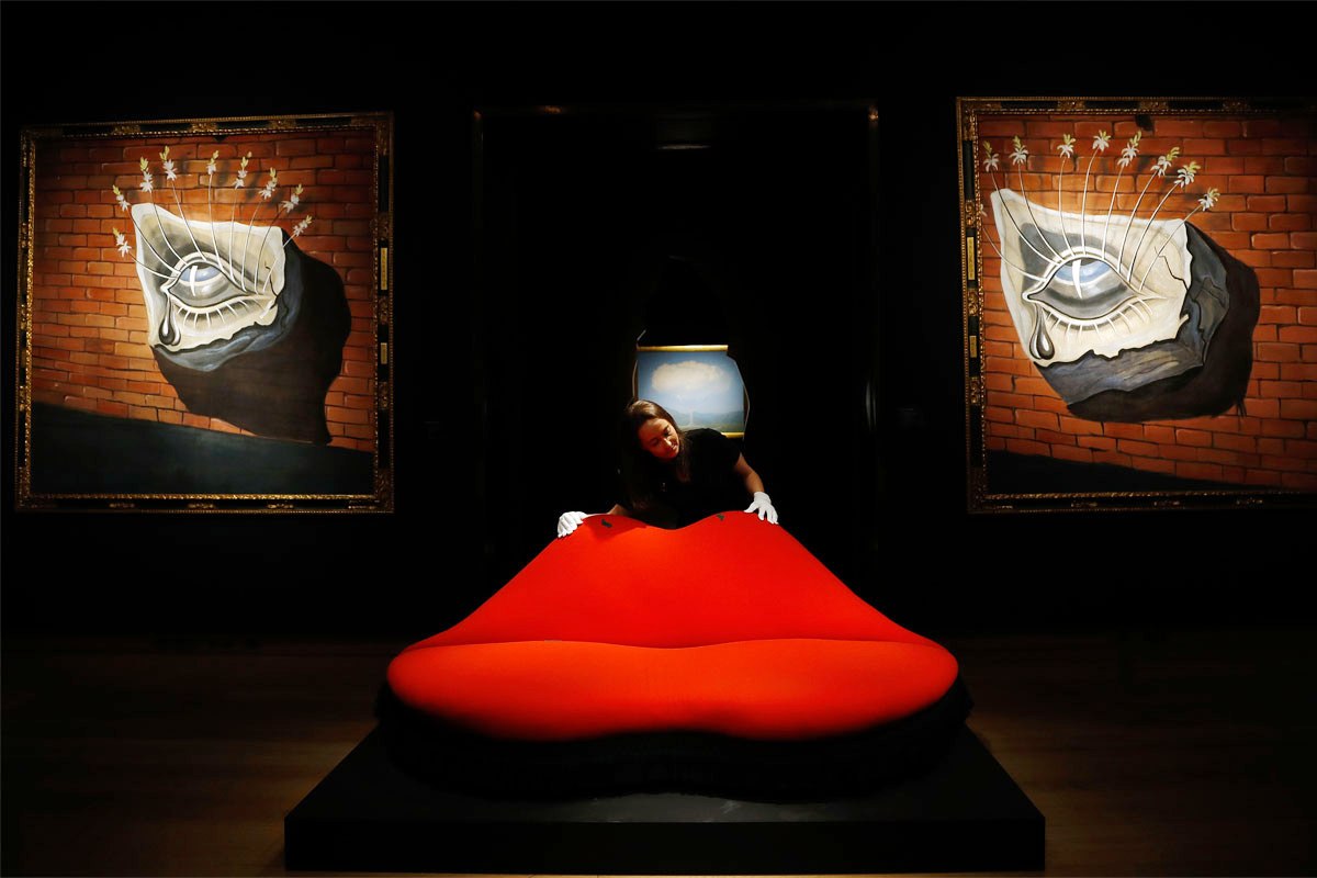 Σε πρώτο πλάνο, ένας κόκκινος καναπές, σχεδιασμένος από τον Νταλί με την ονομασία "Mae West Lips Sofa" και πίσω, δυο πίνακες επίσης του Νταλί ("L'oiel fleuri, decor pour le ballet Trist"), στον Οίκο δημοπρασιών Christie's στο Λονδίνο (2017). ⓒ 2017 Frank Augstein/Associated Press