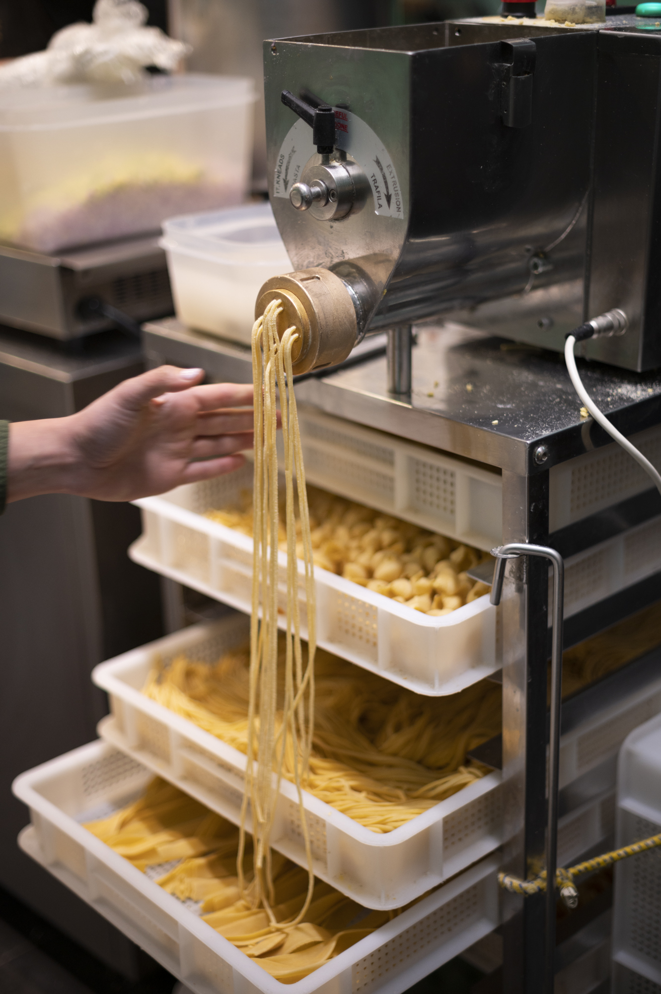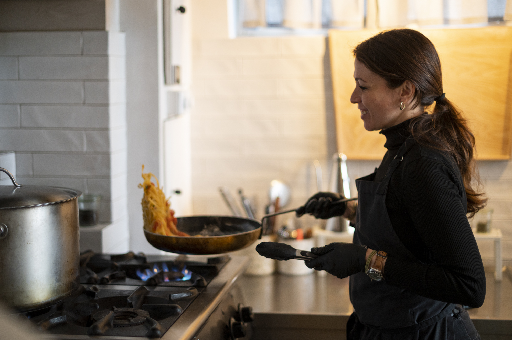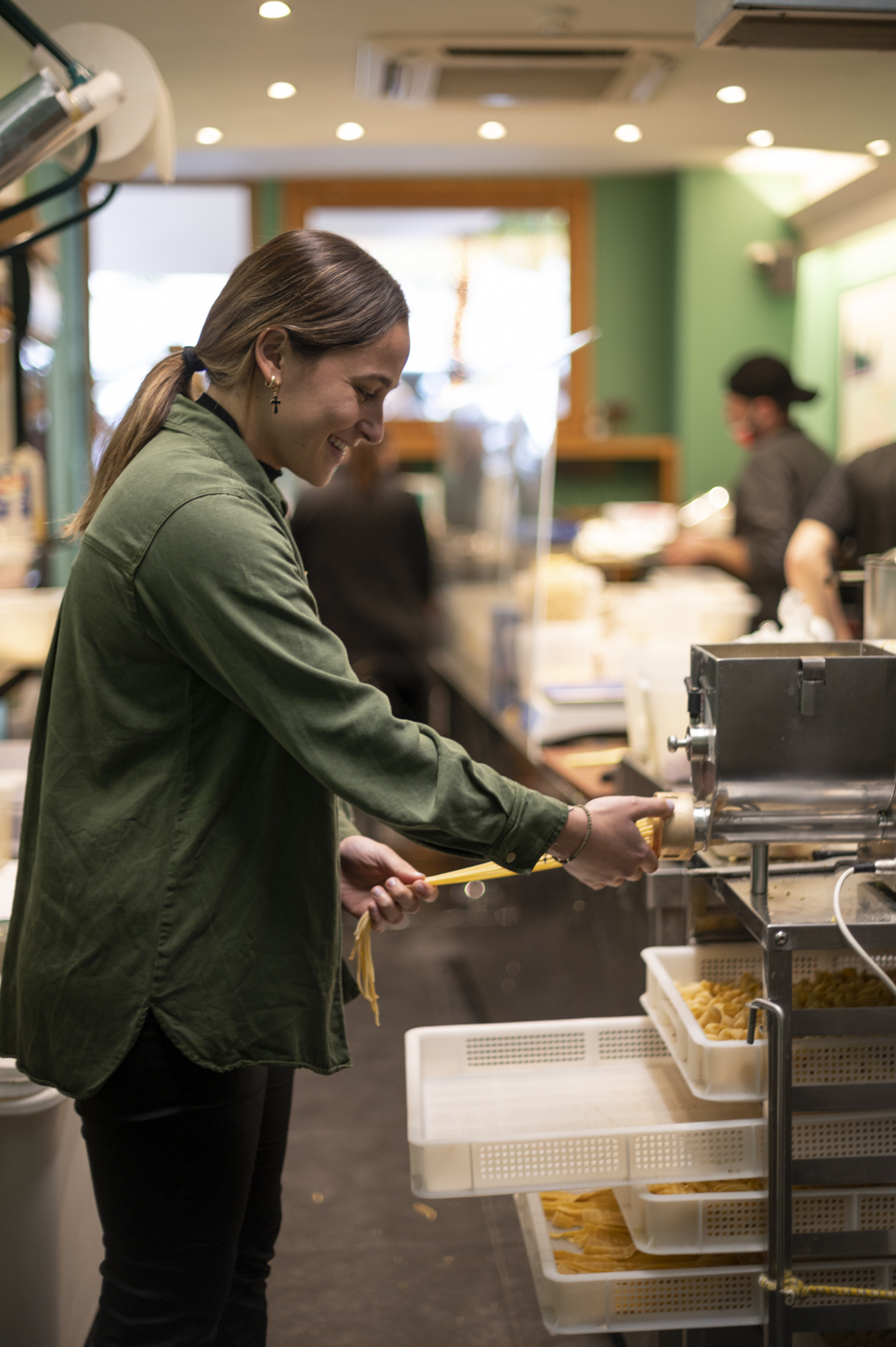 Στο μικρό της εστιατόριο περνάνε όλα από τα χέρια της. Φτιάχνει μόνη της τα κλασικά νιόκι που έκανε η γιαγιά της με κοκκινιστό κρέας ή θαλασσινά και για τις υπόλοιπες συνταγές, επιλέγει ξηρά ζυμαρικά. «Μου ταιριάζουν καλύτερα σε μία Cacio e Pepe ή μία καρμπονάρα». Όλες οι pasta μαγειρεύονται à la minute και τις καθημερινές βρίσκεις συνήθως τρεις διαφορετικές επιλογές, μία με σκουμπρί, με pesto, που εναλλάσσεται με aglio, olio e pepperoncino και φυσικά καρμπονάρα.