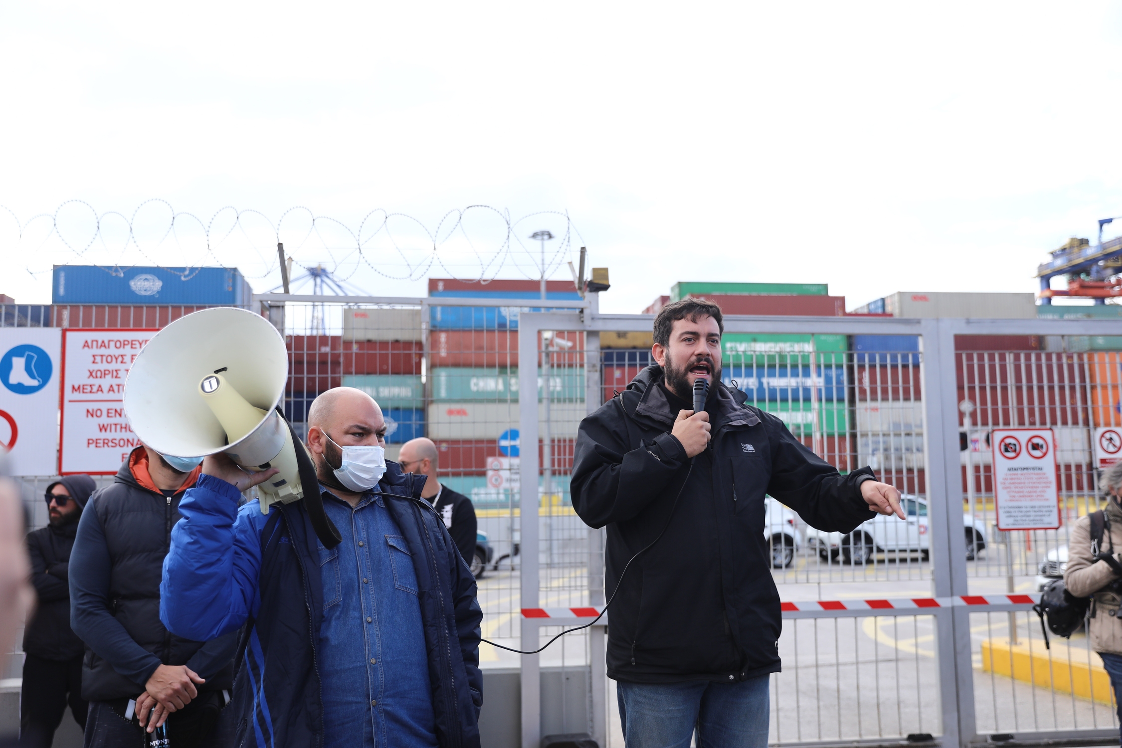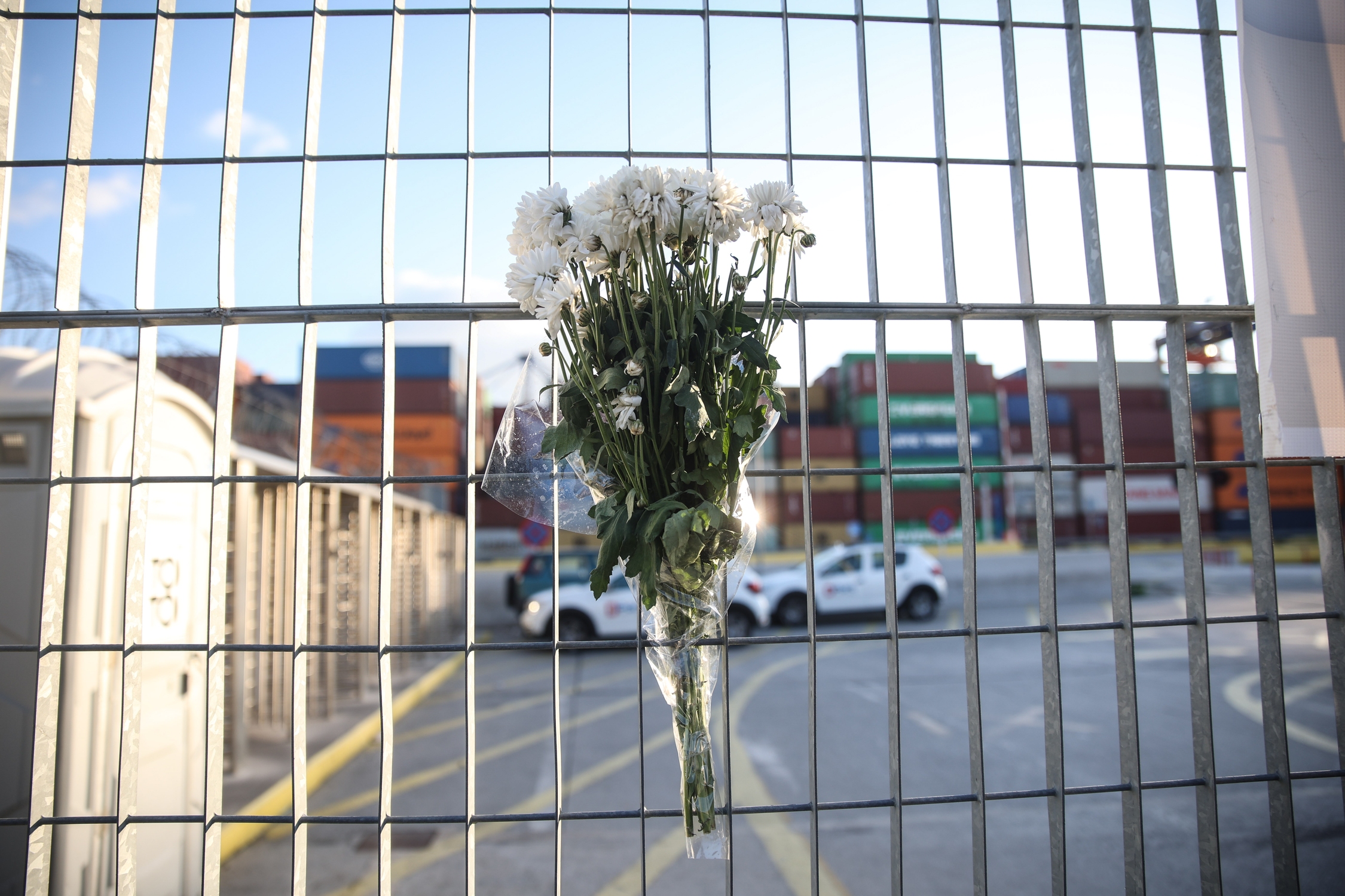Μπροστά στην πύλη, εκατοντάδες εργαζόμενοι φορώντας κίτρινα γιλέκα συμμετέχουν στην γενική συνέλευση. Λίγο πιο δίπλα από το σημείο που βρίσκονται, μερικές ανθοδέσμες περιβάλλουν μια φωτογραφία του Δημήτρη Δαγκλή. Του λιμενεργάτη που έχασε τη ζωή του τη Δευτέρα 25 Οκτωβρίου στη γερανογέφυρα νούμερο 10 του προβλήτα ΙΙ.