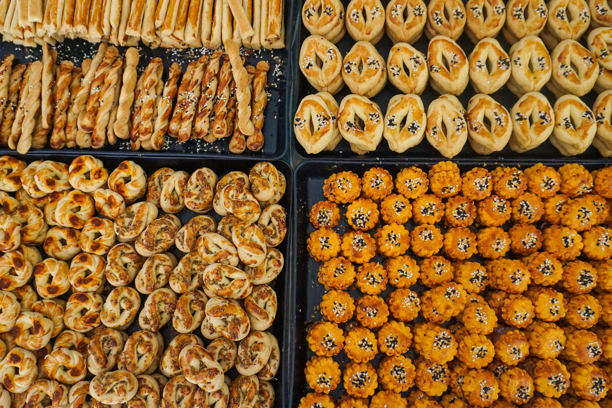 Σιροπιαστά γλυκά, από μπαμπάδες με ρούμι μέχρι μπακλαβάκια, φαγητά με μπαχάρια, αλίπαστα, μυρωδάτο τσουρέκι, σοκολατένιο κίφελ, βουτυράτους ατσμάδες και μία μεγάλη ποικιλία σε αλμυρά κουλούρια, όπως αυτά με τον γλυκάνισο και τα τσατάλια για την ιερή ώρα του τσαγιού.