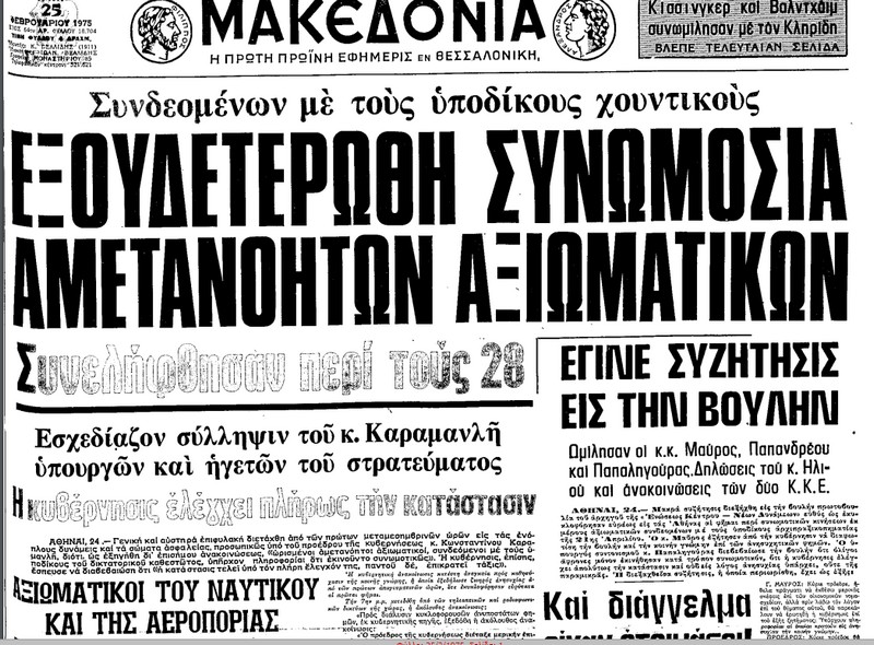 Η εύθραυστη Δημοκρατία απειλήθηκε άμεσα τον Φεβρουάριο του 1975, όταν η κυβέρνηση αποκάλυψε την προσπάθεια μιας ομάδας χουντικών αξιωματικών, προσκείμενοι στον δικτάτορα Ιωαννίδη, να ξαναβάλουν τη χώρα στο γύψο. Ή αν κατάφερναν αυτό, τουλάχιστον, να απέτρεπαν όσα η κοινωνία και η εποχή απαιτούσαν. Μη ξεχνάμε ότι η Ελλάδα είχε αποχωρήσει από το στρατιωτικό σκέλος του ΝΑΤΟ, υπήρχε έντονος αντιμερικανισμός και λαϊκή απαίτηση για τιμωρία των ενόχων της δικτατορίας και πλήρης κάθαρση.