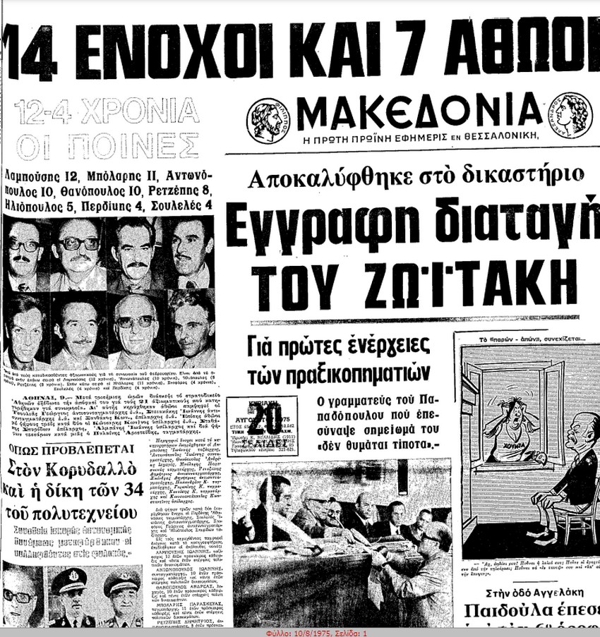 Η πρωτόδικη απόφαση του στρατοδικείου. Ταυτόχρονα διεξαγόταν και η δίκη των απριλιανών στον Κορυδαλλό