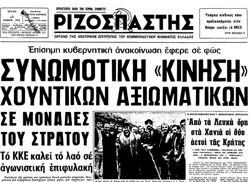 Το πρωτοσέλιδο του Ριζοσπάστη, την επομένη των ανακοινώσεων της κυβέρνησης (25/2/1975)