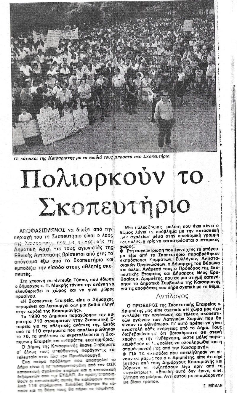 Είναι η εποχή που ο αγώνας της Καισαριανής για την παραχώρηση του σκοπευτήριου κορυφώνεται. Το 1983 γίνεται κατάληψη 17 ημερών και κινητοποιούνται φορείς, σωματεία, απλοί πολίτες. Ο ΠΣΑΠ επισκέπτεται τον πρωθυπουργό Ανδρέα Παπανδρέου, θέτοντας επί τάπητος διάφορα θέματα και ο γενικός γραμματέας του, Νίκος Μάλλιαρης (πρώην παίκτης του Εθνικού Αστέρα, αλλά και δημοτικός σύμβουλος Καισαριανής), βρίσκει την ευκαιρία να θέσει και το θέμα του Σκοπευτηρίου.