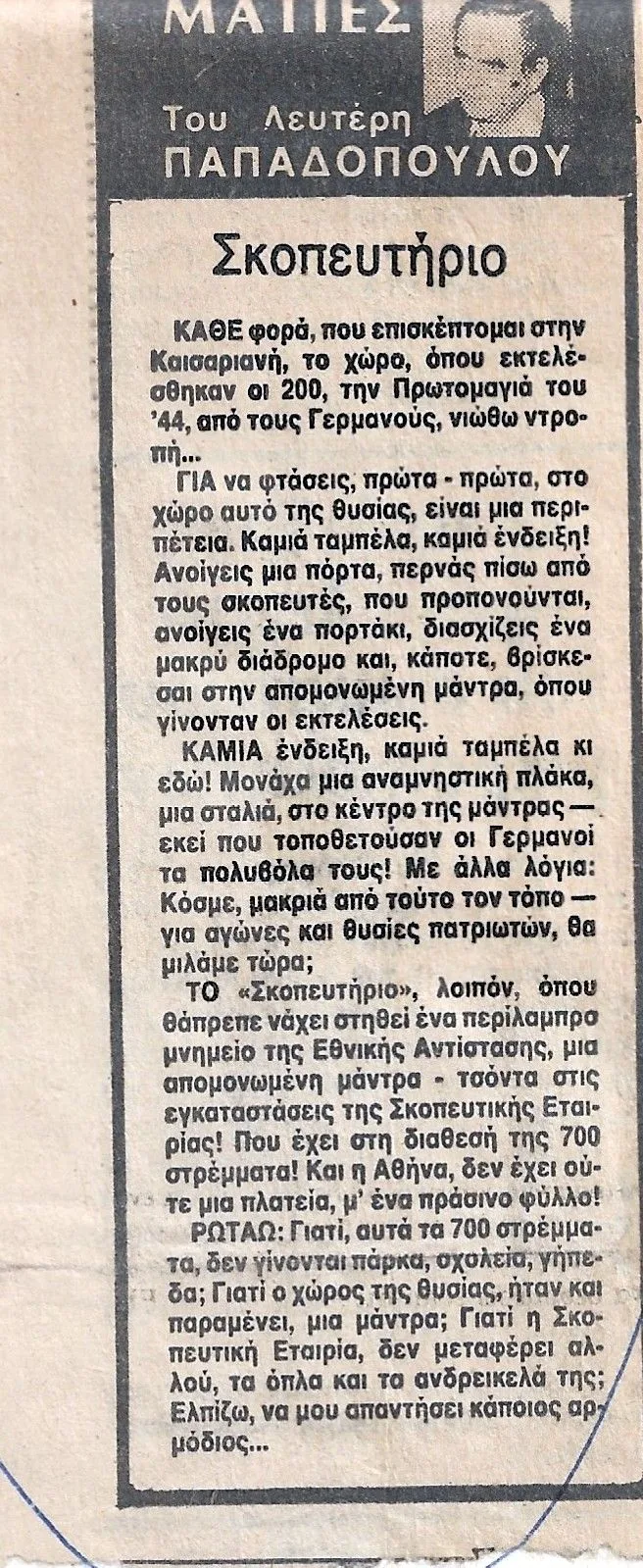 Το Σκοπευτήριο, λοιπόν, όπου θα’ πρεπε ναχει στηθεί ένα περίλαμπρο μνημείο της Εθνικής Αντίστασης, μια απομονωμένη μάντρα-τσόντα στις εγκαταστάσεις της Σκοπευτικής Εταιρίας. Που έχει στη διάθεσή της 700 στρέμματα! Και η Αθήνα δεν έχει μια πλατεία, με ένα πράσινο φύλλο!