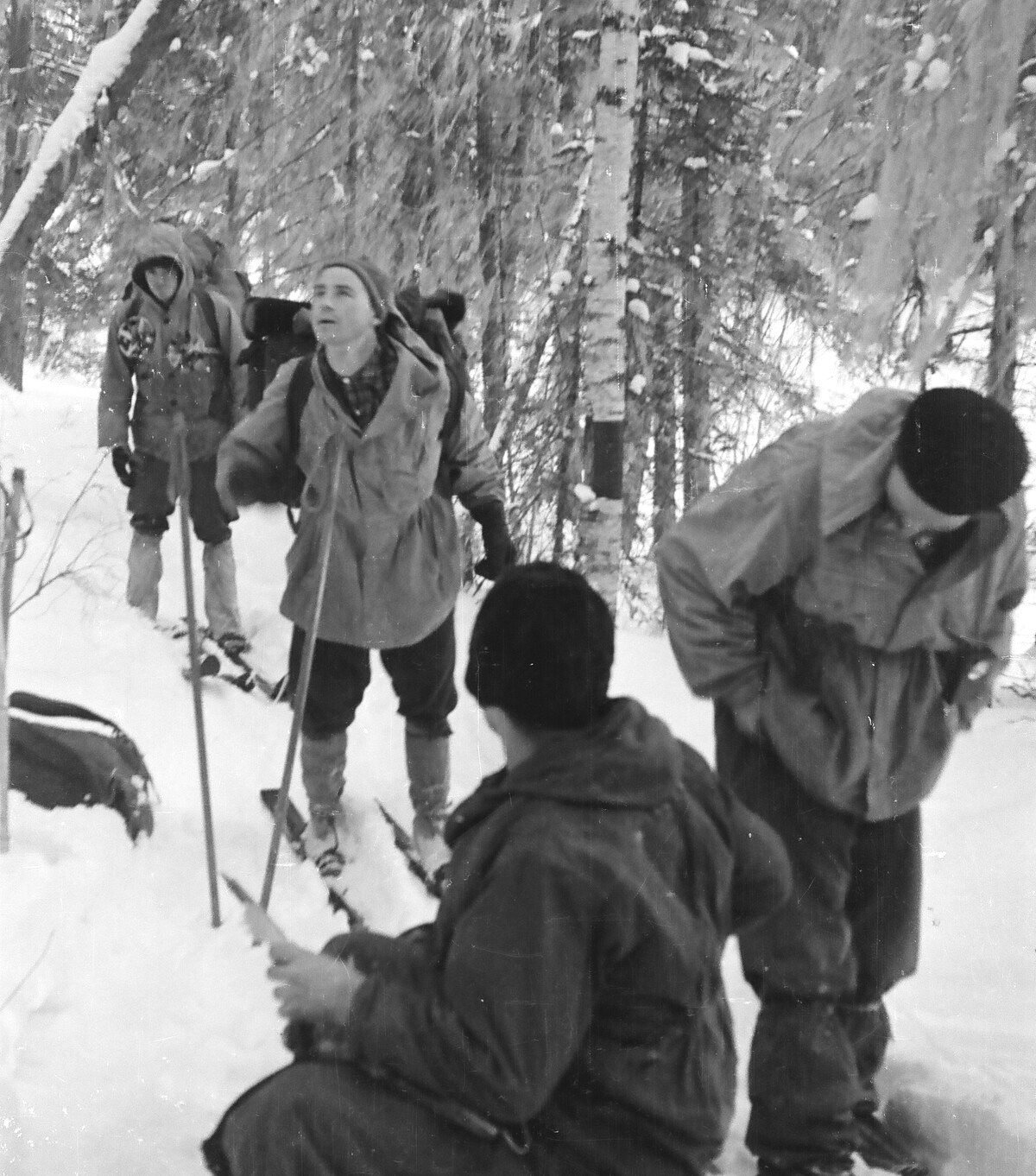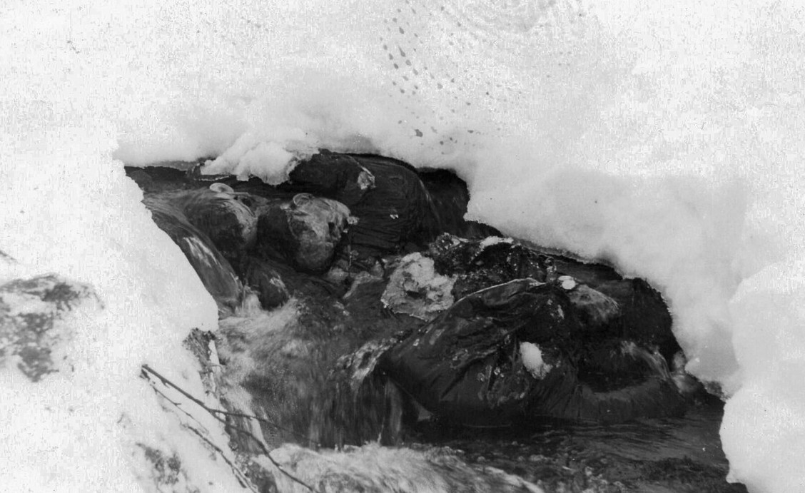- Οι εναπομείναντες τέσσερις, οι μόνοι με ζεστά ρούχα και παπούτσια, προσπαθούσαν να βρουν ένα κατάλληλο μέρος μέσα στο δάσος για να στήσουν ένα πρόχειρο κατάλυμα μέχρι να περάσει ο κίνδυνος. Τα πτώματά τους βρέθηκαν 75 μέτρα μακριά από τη φωτιά, κάτω από αρκετά μέτρα χιονιού και με τραύματα που υποδήλωναν ότι είχαν πέσει στο κενό από μια τρύπα που είχε καλυφθεί από το χιόνι, πάνω από ένα ρέμα.