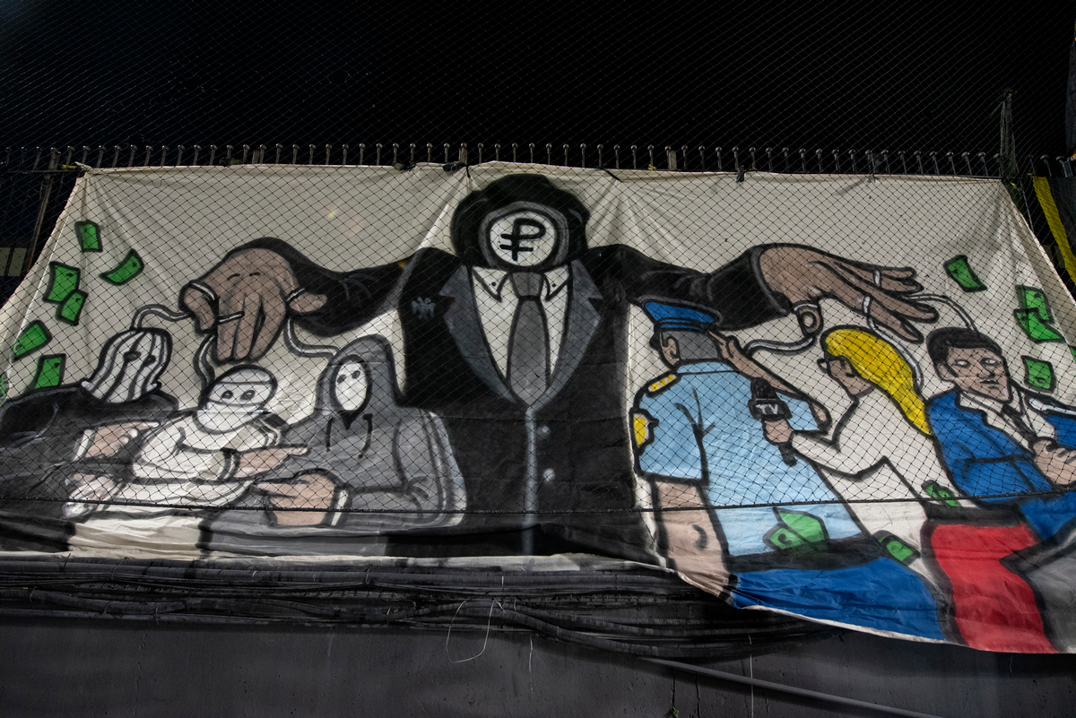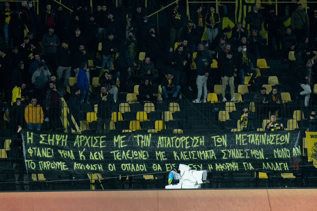 Μετά, ήταν η επιλογή των οργανωμένων του Άρη να σηκώσουν συγκεκριμένα πανό στα κάγκελα. Τα πανό σε τέτοιες περιπτώσεις είναι η γλώσσα του σώματος της κερκίδας. Υπήρχε ένα μεγάλο με πολλά λόγια στην Θύρα 2, ακριβώς απέναντι από το σημείο που μεταδίδεται η τηλεοπτική εικόνα του αγώνα. Σηκώθηκε κι ένα δεύτερο στην πλευρά της Θύρας 3, το οποίο έγραφε μεταξύ άλλων τη λέξη «Ρούβλιγκανς», βάζοντας δηλαδή στο ίδιο πακέτο τους χούλιγκαν και τα χρήματα του Ιβάν Σαββίδη.