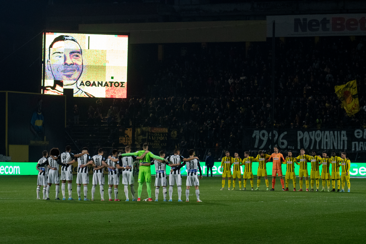 Στιγμές πριν από τη σέντρα, ο γενικά αποδεκτός αρχηγός του ΠΑΟΚ Αντελίνο Βιεϊρίνια κατευθύνθηκε στο μνημείο των οπαδών μπροστά στη Θύρα 3 και άφησε λουλούδια – είχε κάνει το ίδιο προ ημερών στο σημείο της δολοφονίας. Κανείς δεν τον χειροκρότησε, πολλοί άρχιζαν να φωνάζουν «δολοφόνοι, δολοφόνοι». Ακραίο και η δικαιολογία σε αυτό θα μπορούσε να είναι πως η τραγωδία είναι ακόμη νωπή. Το ματς ξεκίνησε στις 7.30 κι έπρεπε να ασχοληθούμε με το ποδόσφαιρο.