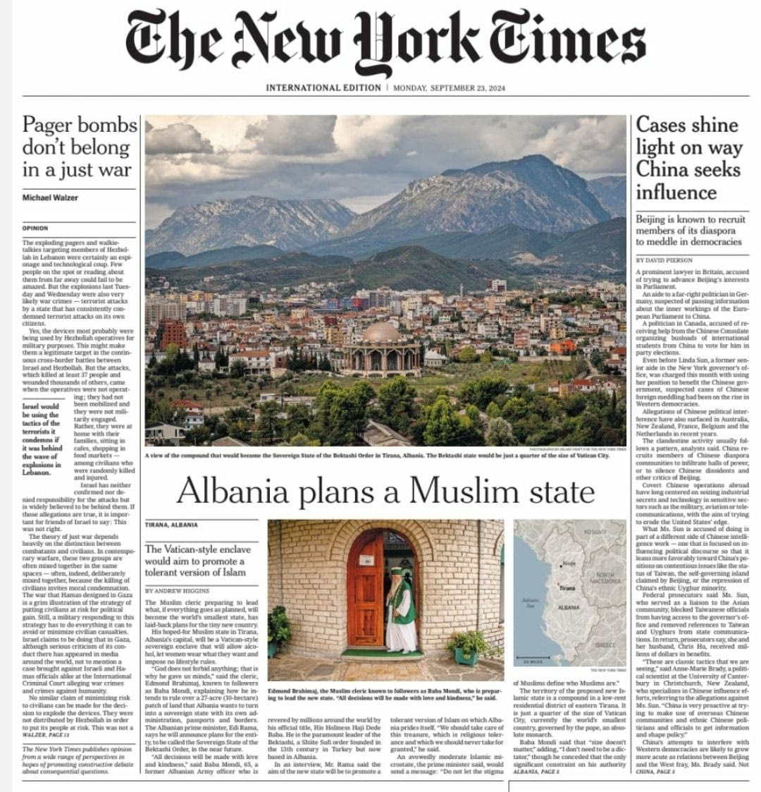 Και αίφνης όλοι ασχολούνται με τους μπεκτασήδες. Στην Αλβανία, στην Ελλάδα και όχι μόνο – ακόμα και το πρωτοσέλιδο των New York Times (23.9.2024). Βέβαια, ο τίτλος «Albania plans a Muslim state» δεν είναι αυτός ακριβώς που θα επιθυμούσε ο Έντι Ράμα. Άλλο προσδοκούσε, κι όχι προκαλεί τα αντιισλαμικά αντανακλαστικά της Δύσης.